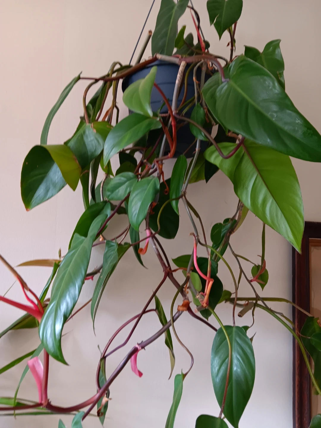 This lush heartleaf philodendron is in a dark blue hanging pot. It's got glossy green leaves and striking reddish stems. The plant trails beautifully, adding greenery to any space.