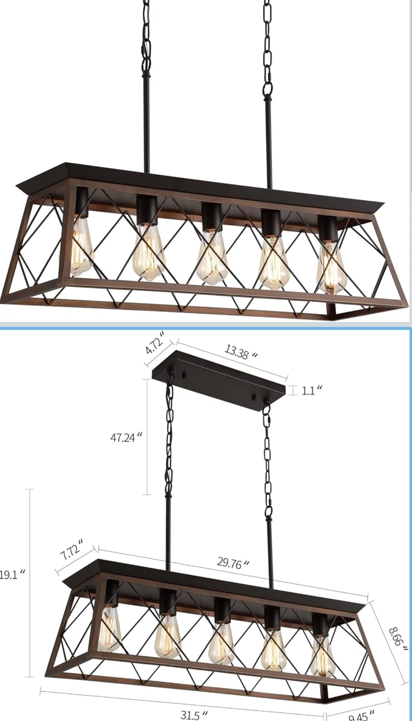 This farmhouse-style chandelier features a black metal frame with a rustic wood finish. It has five lights and a rectangular cage design. The fixture measures 31.5 inches wide and 8.66 inches in height, with an adjustable hanging length. It's perfect for dining rooms or kitchen islands!