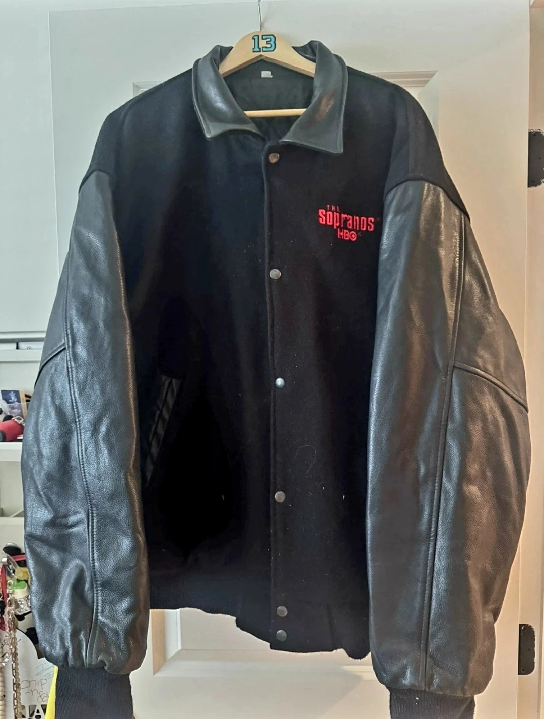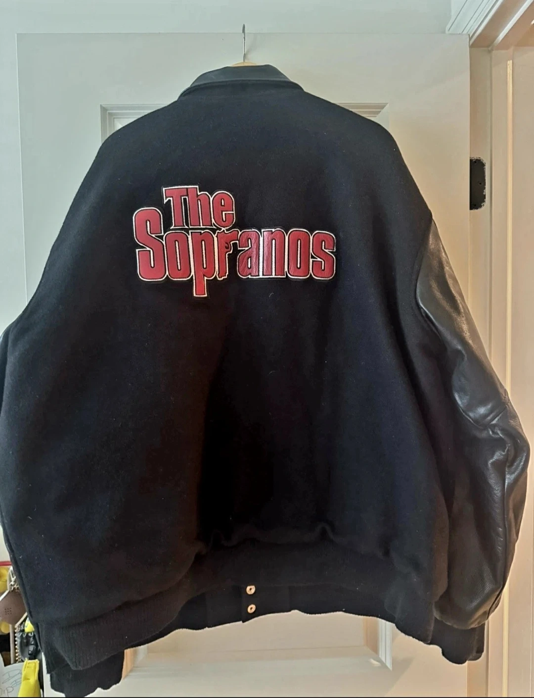 This black letterman jacket features the "The Sopranos" logo on the chest and back. It has faux leather sleeves and a snap button closure. A must-have for fans! Size XL pickups in Scarborough or vaughan asking $400