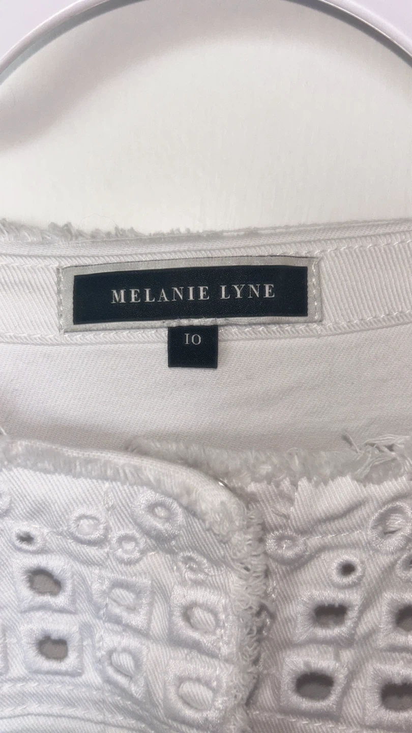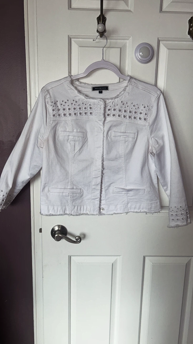 15Selling a cute white Melanie Lyne jacket in size 10. It's made of 89% cotton, 10% polyester, and 1% spandex. Perfect for layering! Worn a few times - regular $89 Make me an offer. I’m not picky