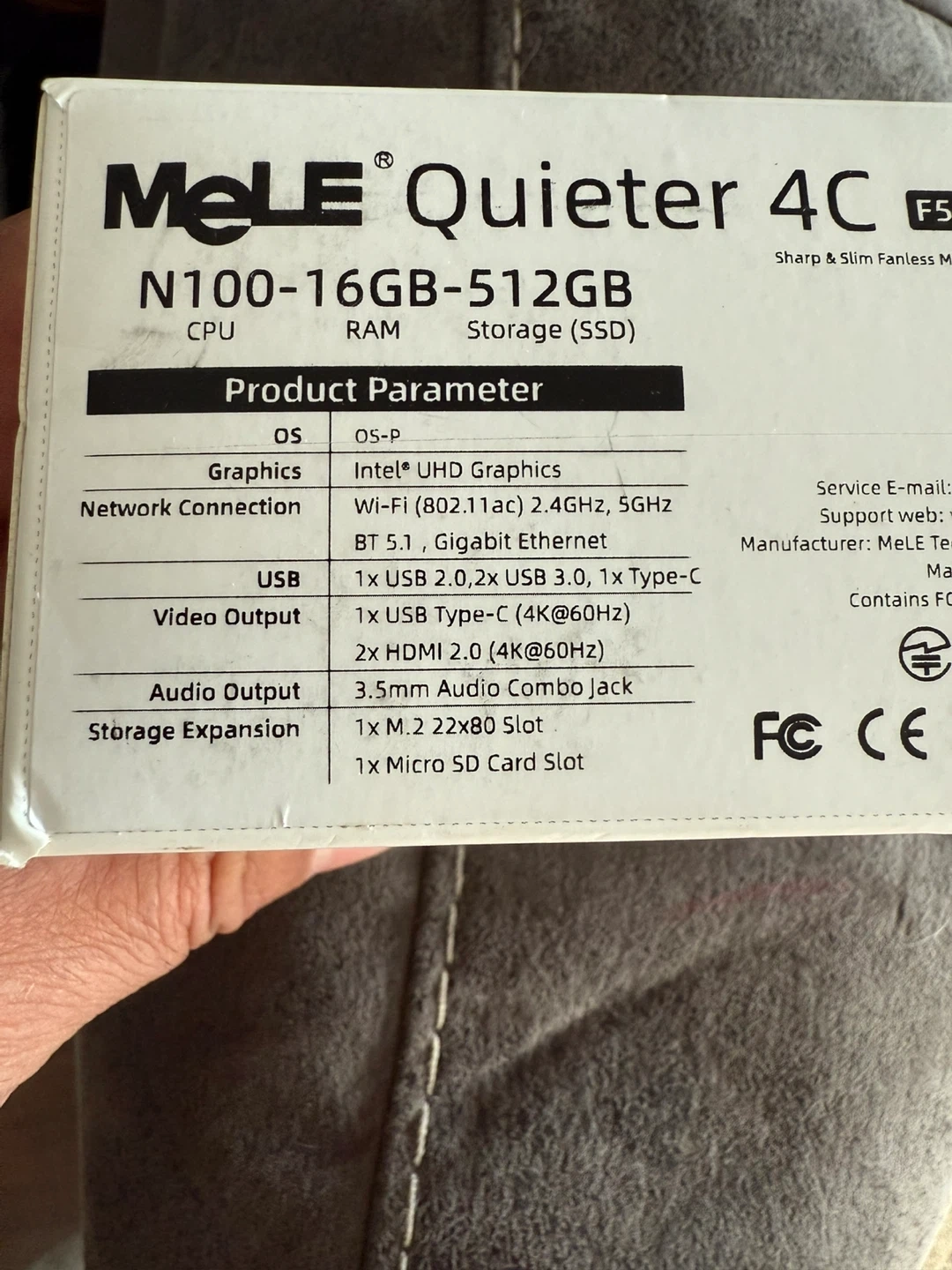 Selling a MeLE Quieter 4C Fanless Sharp & Slim Mini PC. This mini PC comes with: - N100-16GB-512GB - Intel UHD Graphics - Wi-Fi (802.11ac) 2.4GHz, 5GHz - BT 5.1, Gigabit Ethernet - 1x USB 2.0, 2x USB 3.0, 1x Type-C - 1x USB Type-C (4K@60Hz) - 2x HDMI 2.0 (4K@60Hz) - 3.5mm Audio Combo Jack - 1x M.2 22x80 Slot - 1x Micro SD Card Slot