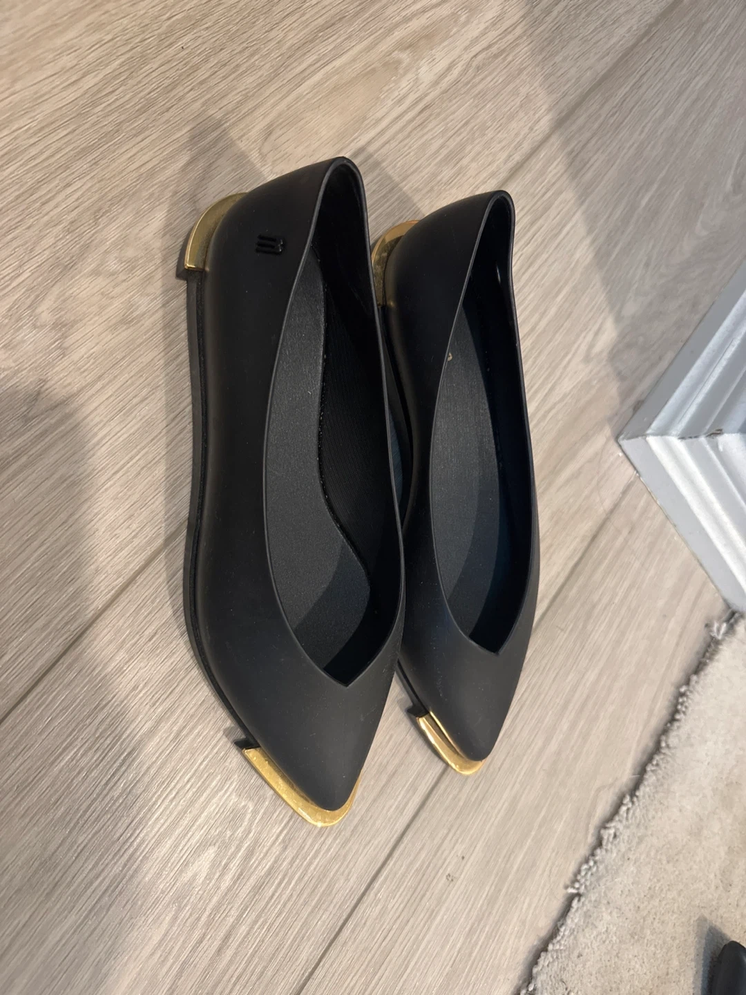 17Selling a pair of Melissa black flats in size 7. They feature a sleek design with gold accents. Perfect for adding a touch of elegance to any outfit!
