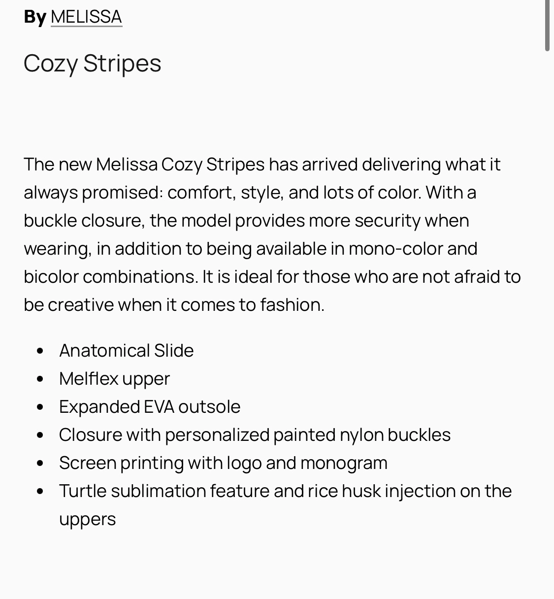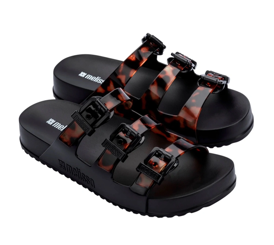 Brand New, Never Used. Black and tortoise shell coloured sandals with adjustable buckles. By MELISSA Cozy Stripes The new Melissa Cozy Stripes has arrived delivering what it always promised: comfort, style, and lots of color. With a buckle closure, the model provides more security when wearing, in addition to being available in mono-color and bicolor combinations. It is ideal for those who are not afraid to be creative when it comes to fashion. • Anatomical Slide • Melflex upper • Expanded EVA outsole • Closure with personalized painted nylon buckles • Screen printing with logo and monogram • Turtle sublimation feature and rice husk injection on the uppers