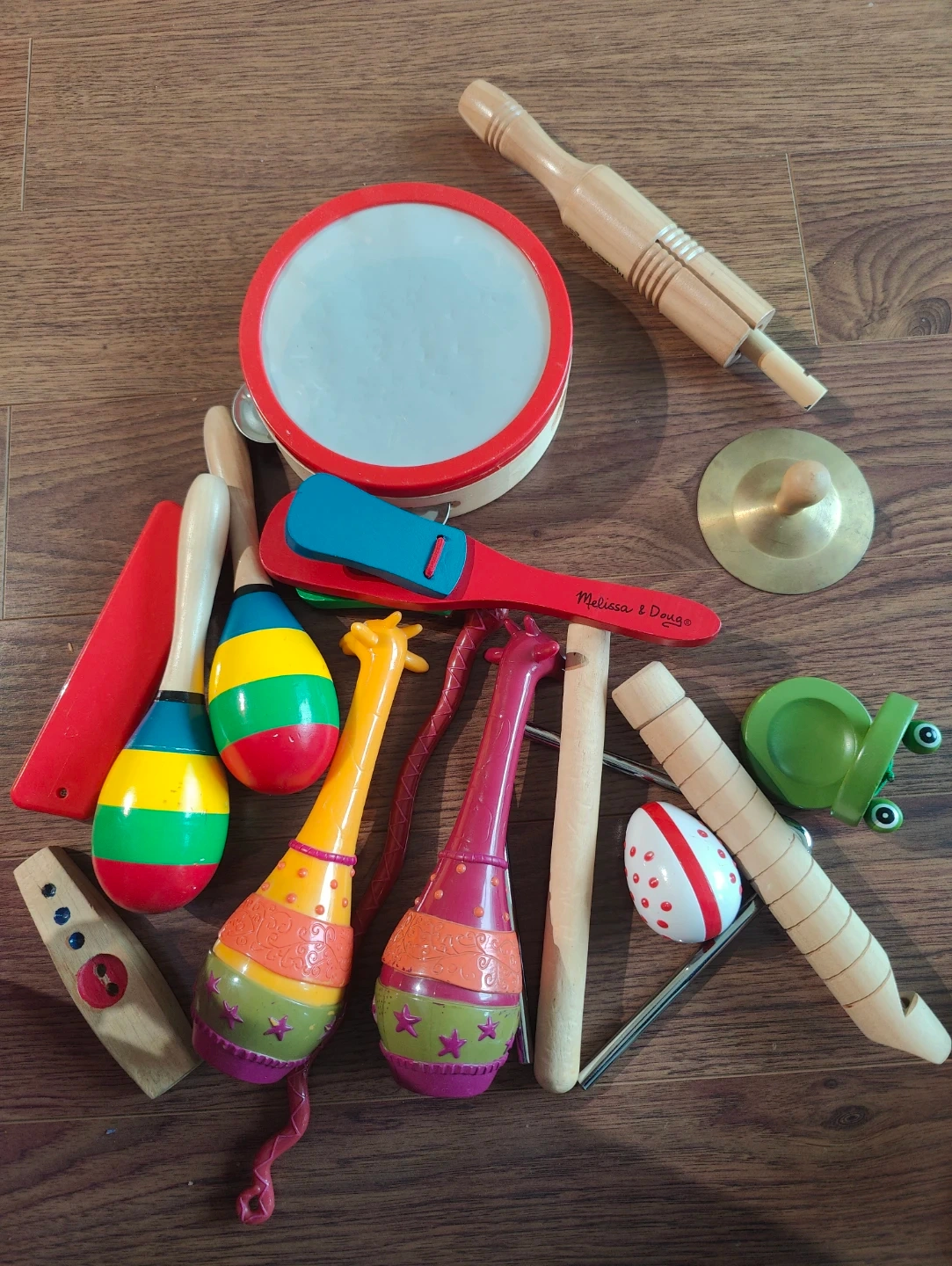 60A fun collection of musical instruments from Melissa & Doug and other brands Includes maracas, a tambourine, and more. Great for kids who love to make music!