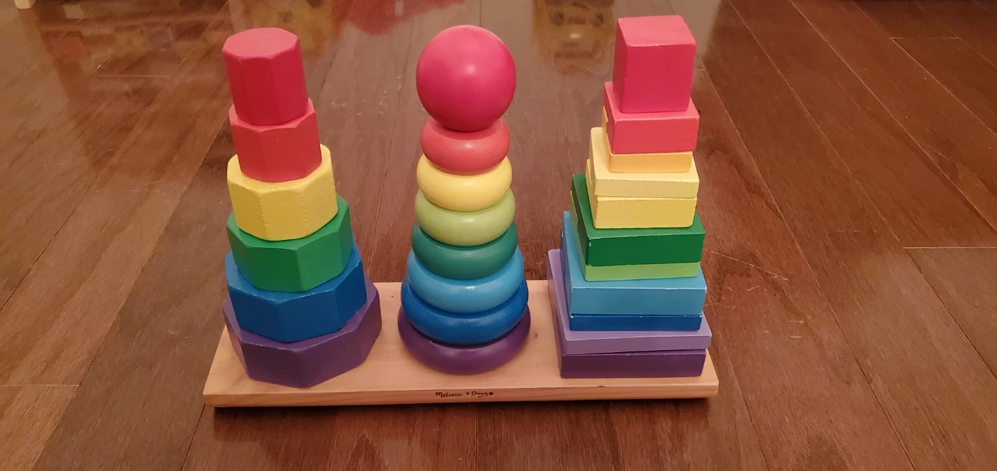 65I'm selling a Melissa & Doug stacking toy set! It's a colourful wooden toy that includes three different stacking designs. Great for kids learning shapes and colours!