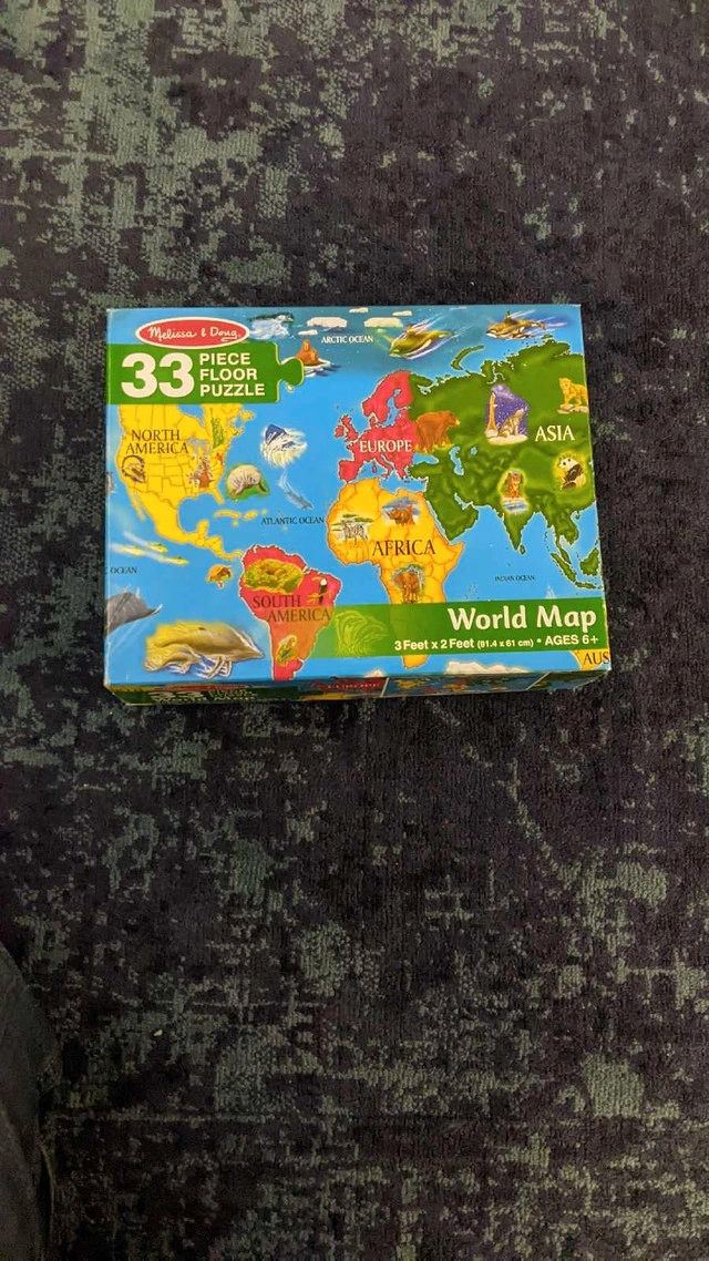 81Explore the world with this Melissa & Doug 33-piece World Map Floor Puzzle, perfect for ages 3+. This used puzzle is in good condition and ready for new adventures. Key features: * **Brand:** Melissa & Doug * **Type:** Floor Puzzle * **Number of Pieces:** 33 * **Theme:** World Map * **Recommended Age:** 3+ years * **Dimensions:** 3 feet x 2 feet when assembled Used puzzles like this typically sell for between $10 and $20. Given the condition, I've priced it competitively for a quick sale. If the ad is up, the puzzle is available, so no need to ask! This puzzle is just waiting to be snatched up and taken on a whimsical journey to a new home.