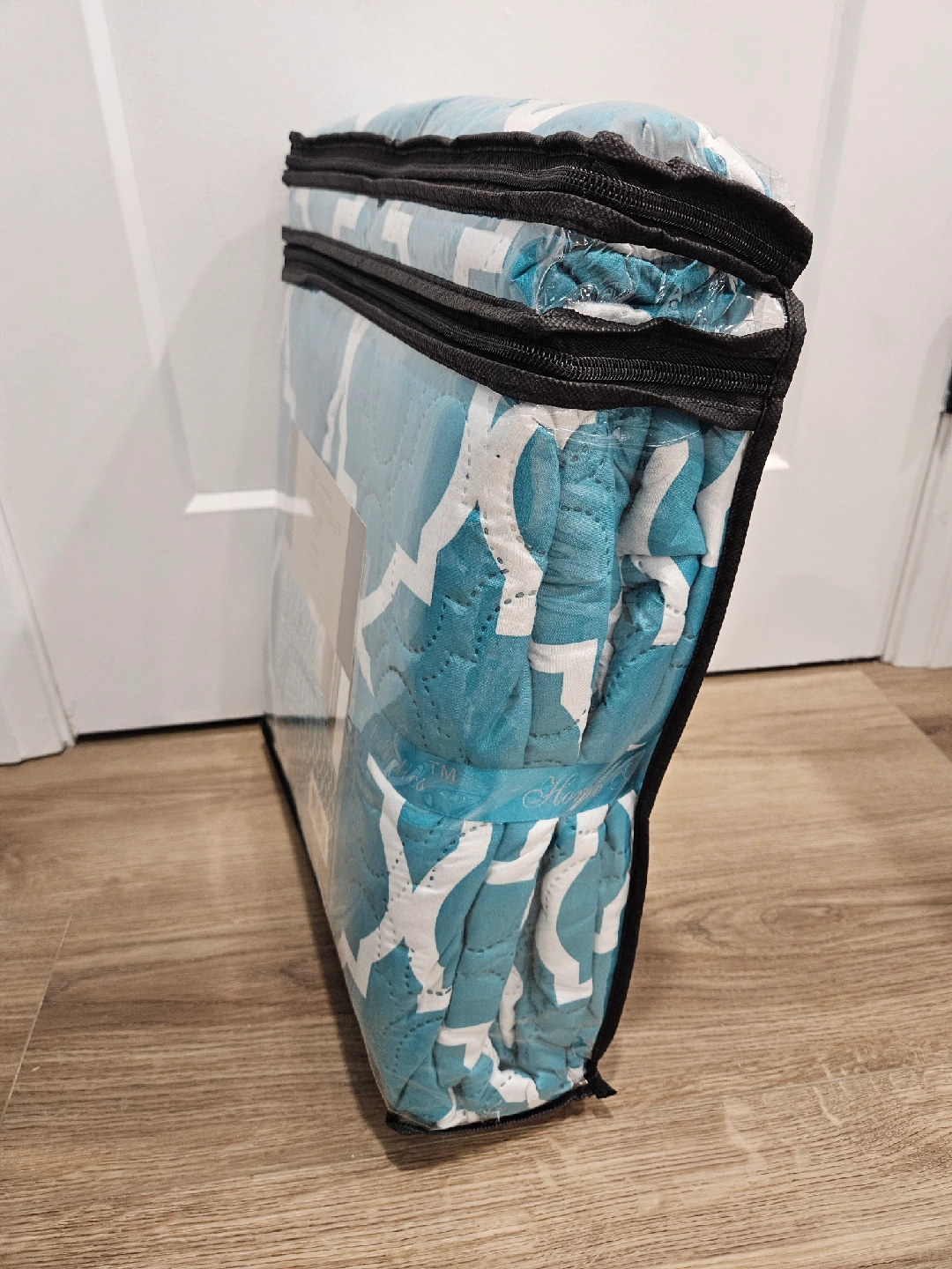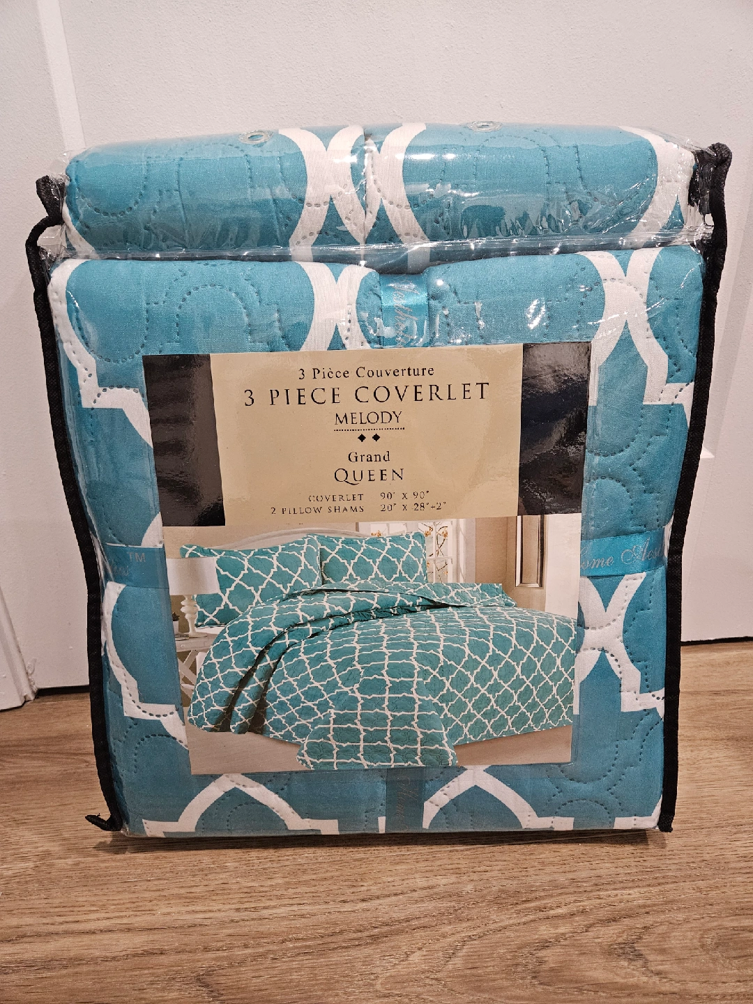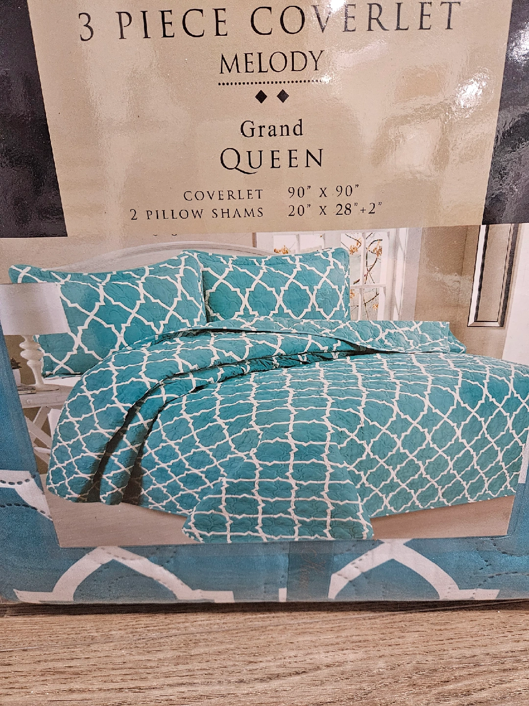 Selling a brand new Melody 3-piece coverlet set in the original packaging! This set is a Grand Queen size and includes: - Coverlet: 90" x 90" - 2 Pillow Shams: 20" x 28" + 2"