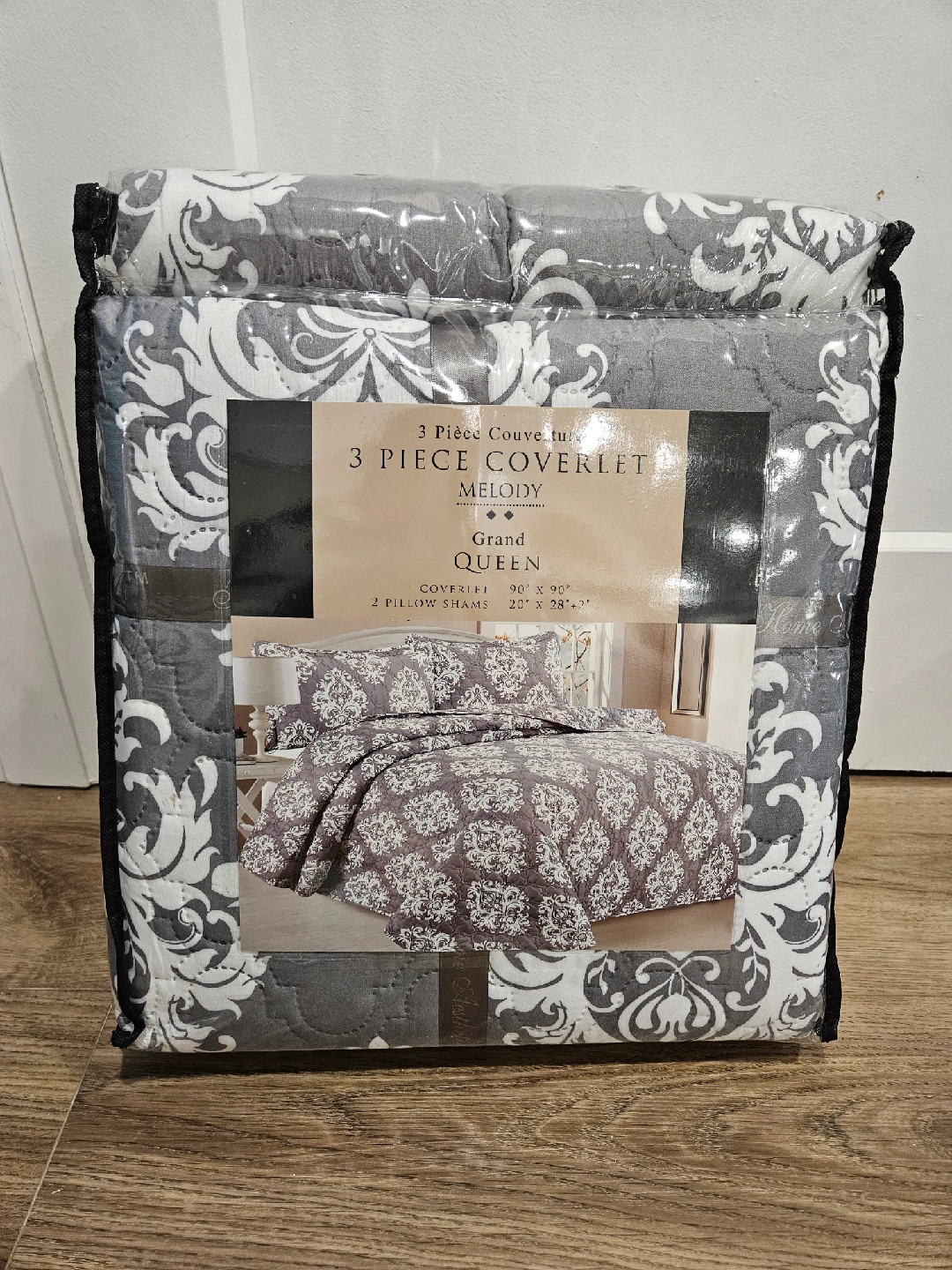 Selling a brand new Melody Grand Queen 3-Piece Coverlet set! The set includes a coverlet (90" x 90") and two pillow shams (20" x 28" + 2")