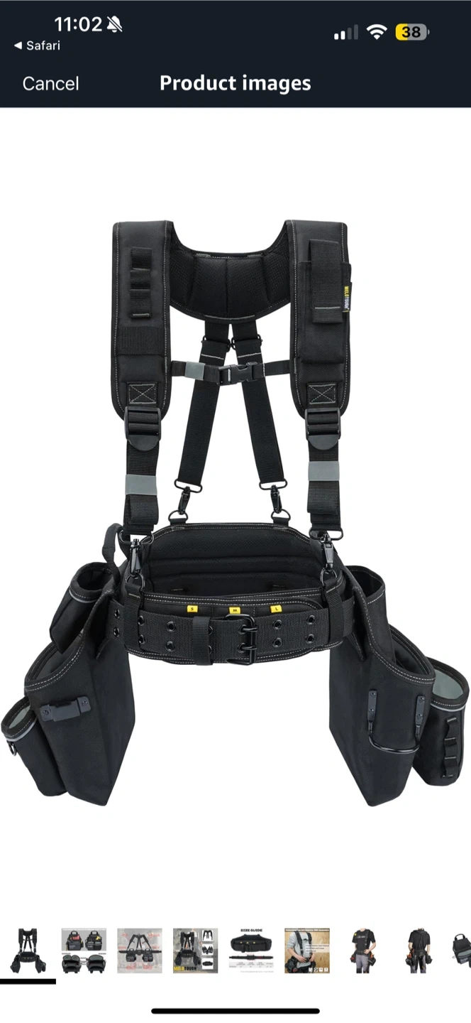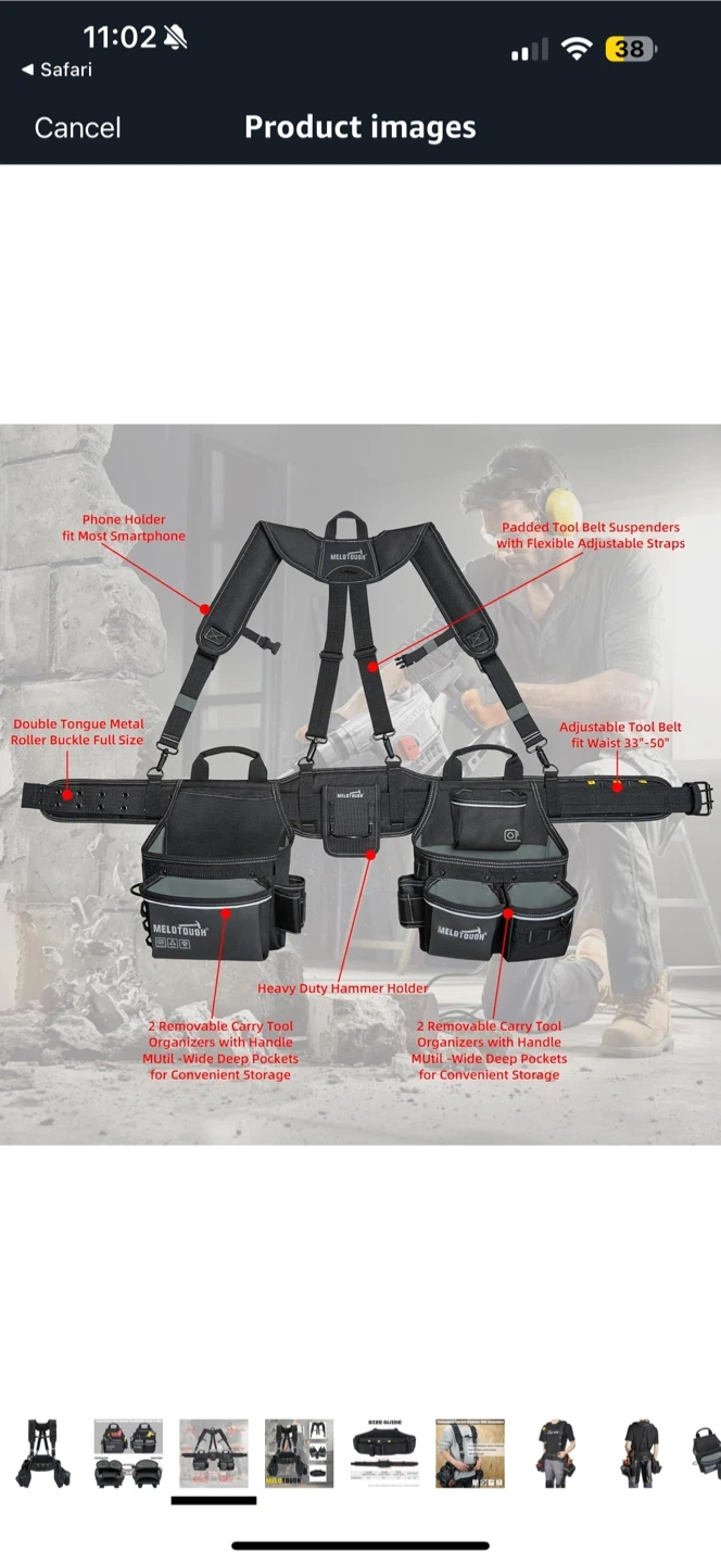 Get ready to tackle any job with this MELOTOUGH heavy-duty tool belt with suspenders! Features include: - Padded tool belt suspenders - Adjustable tool belt fits waist 31"-50" - Phone holder that fits most smartphones - Heavy duty hammer holder - Two removable carry tool pouches with wide, deep pockets for convenient storage