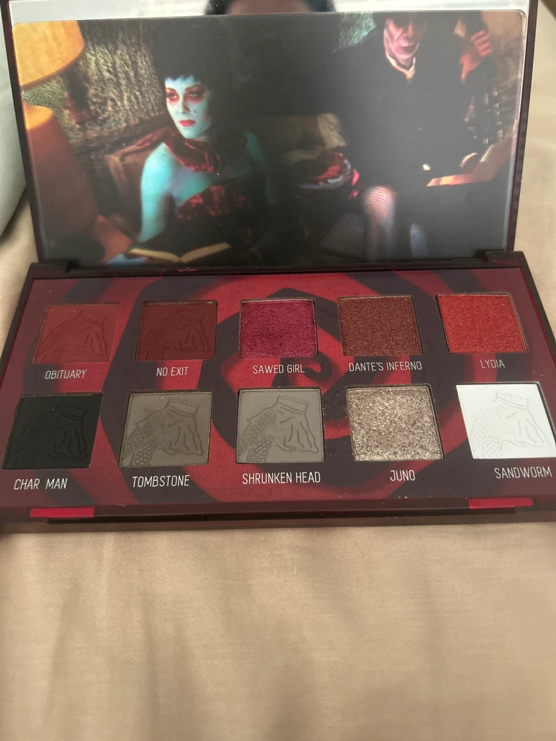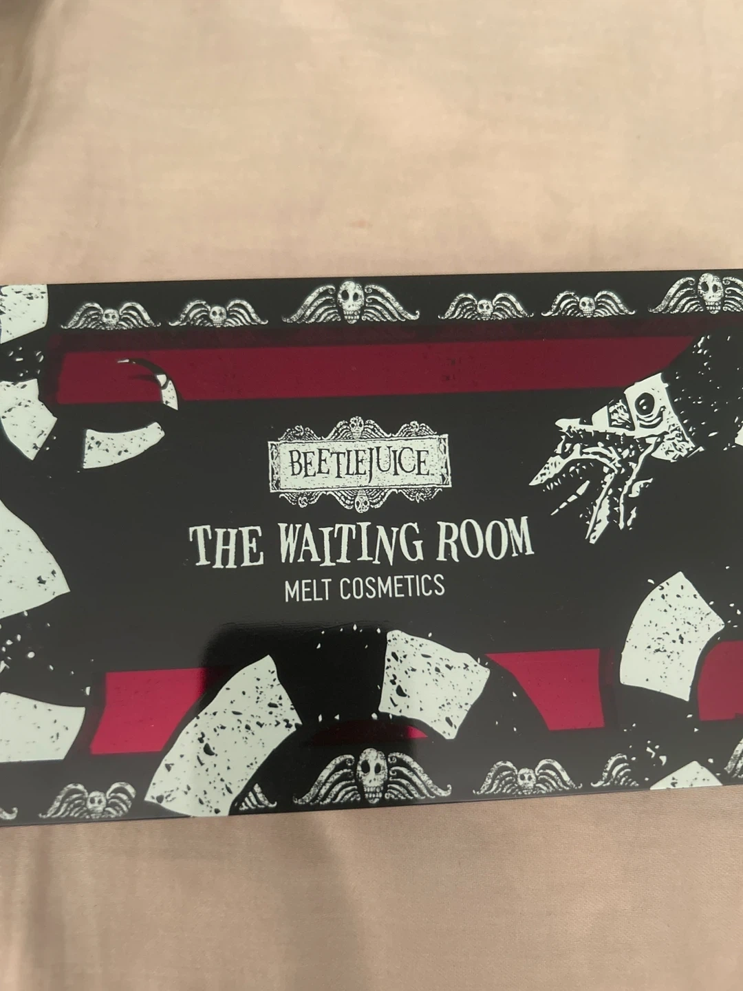 405Selling a Melt Cosmetics Beetlejuice The Waiting Room eyeshadow palette. It features a variety of shades, including Obituary, No Exit, Sawed Girl, Dante's Inferno, Lydia, Char Man, Tombstone, Shrunken Head, Juno, and Sandworm Halloween Collectors item