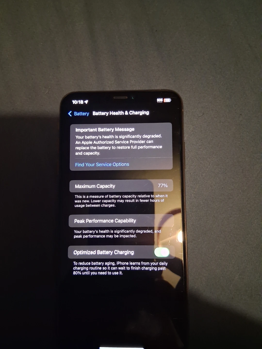 This is an Apple iPhone Xs in gold with 64 GB of storage. The maximum battery capacity is 77%. Optimized battery charging is enabled.