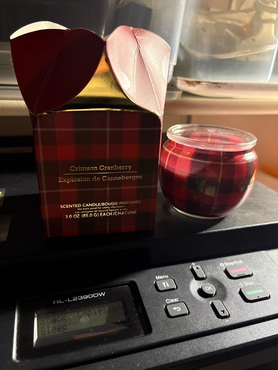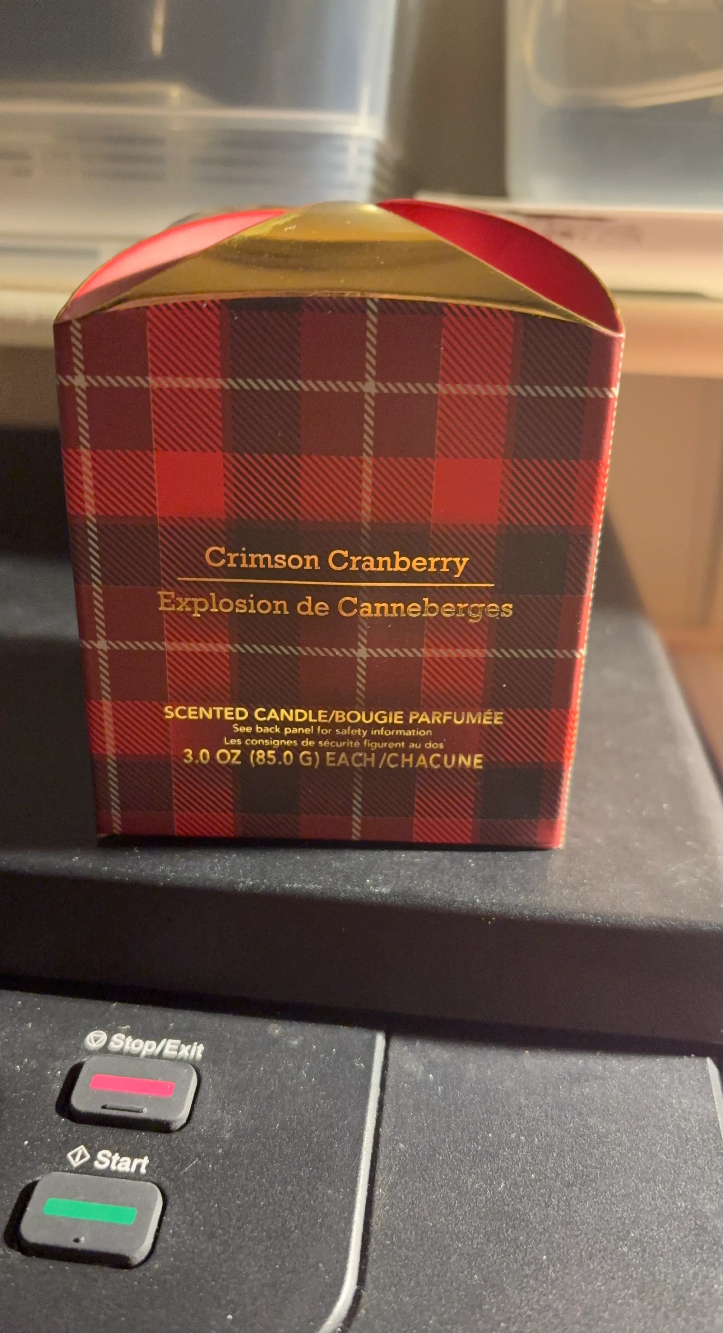This is a Crimson Cranberry scented candle. It weighs 3.0 oz (85.0 g). This candle's packaging is festive with a red and black plaid design.