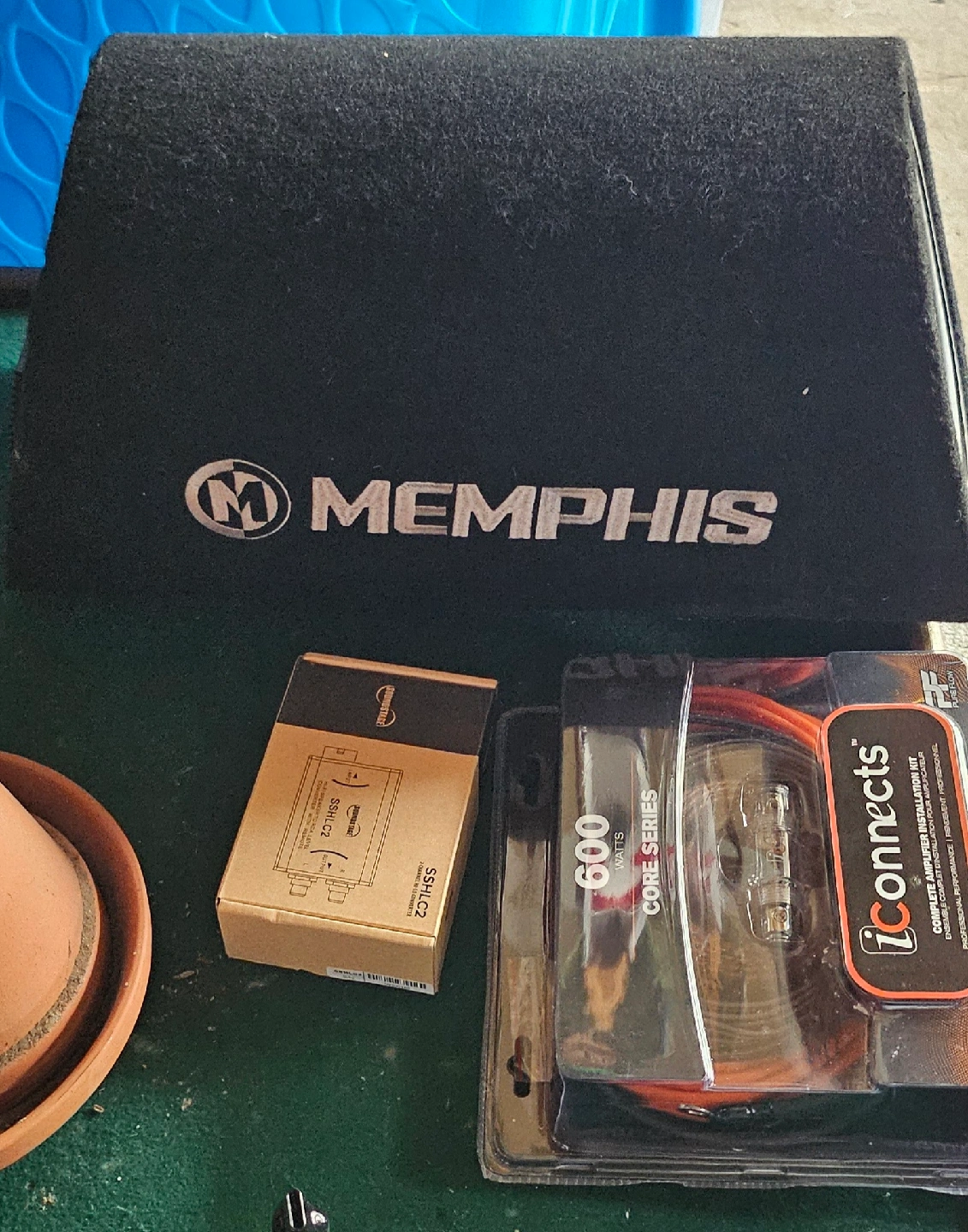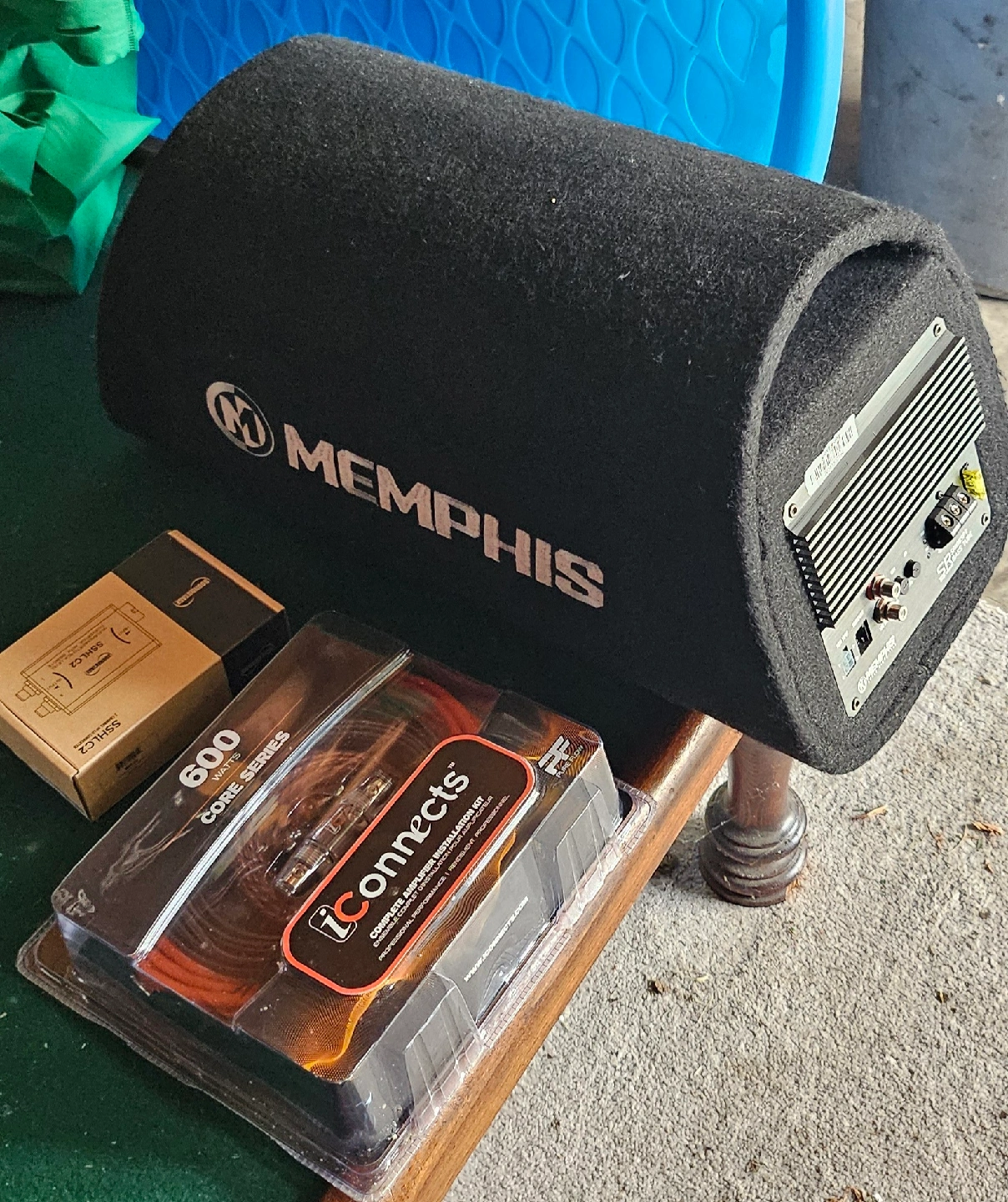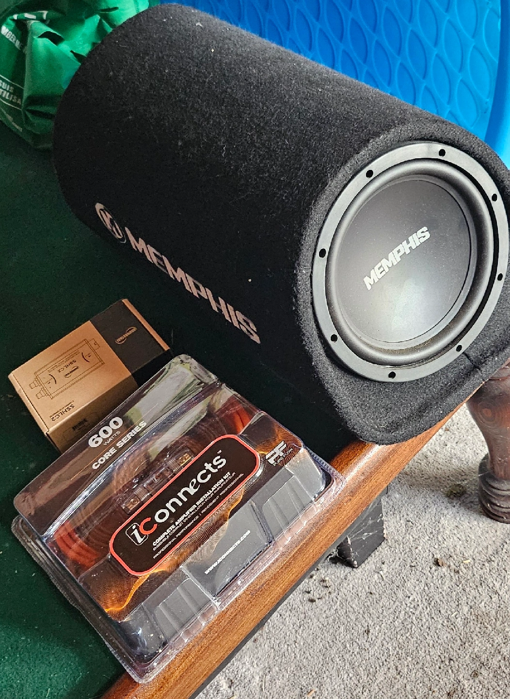 Selling a Memphis subwoofer, along with an Iconnects complete amplifier installation kit! The subwoofer appears to be in good condition. Also included is a box labelled 'SSHL-C2'. Great for upgrading your car's audio system