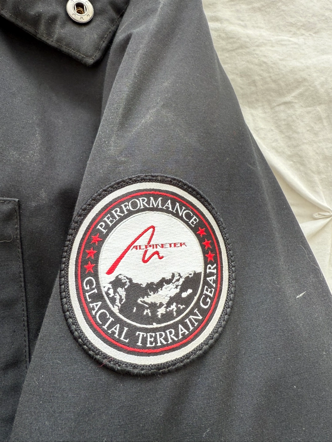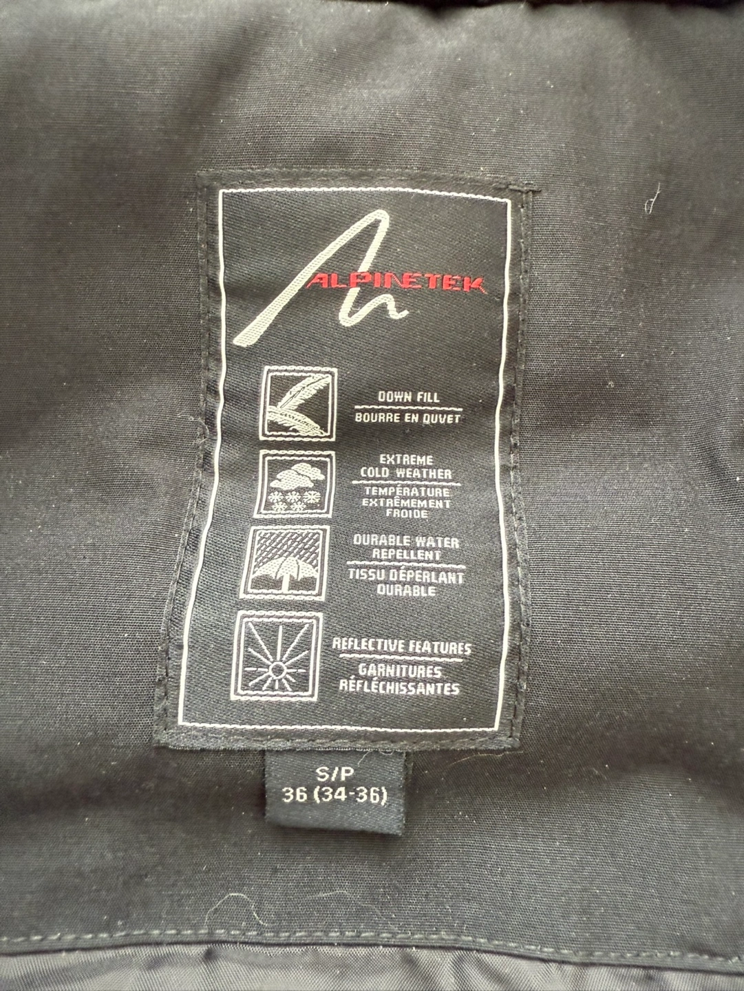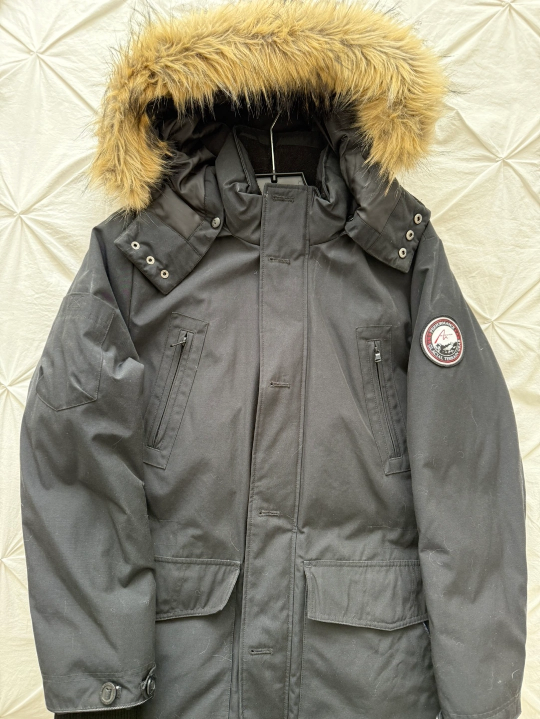 116Men's black winter parka. Features a faux fur-lined hood, multiple pockets, and a durable water-repellent exterior. Down fill. Size small.