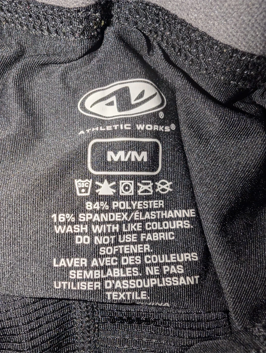 Selling a pair of Athletic Works leggings in size medium. They're black and made of 84% polyester and 16% spandex. Super comfy for workouts or just lounging around!