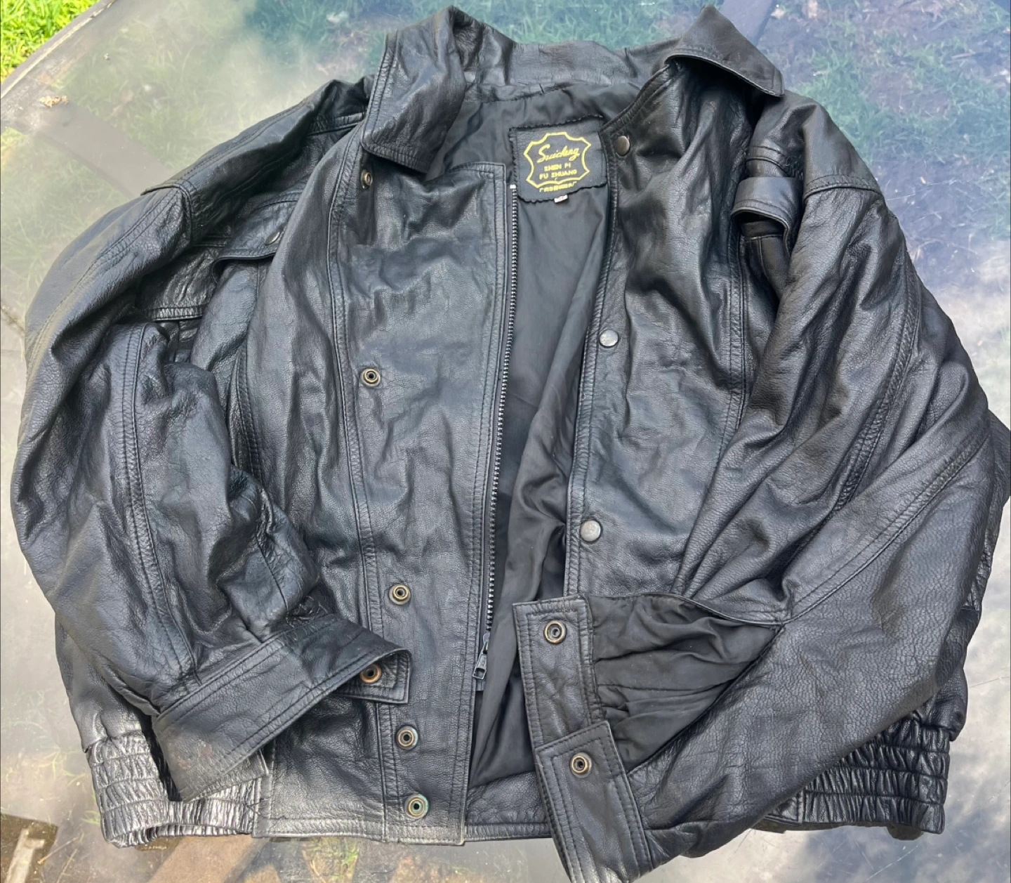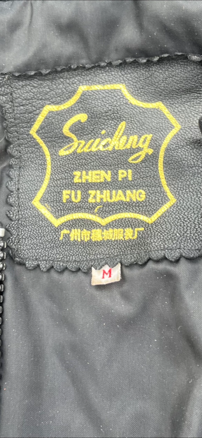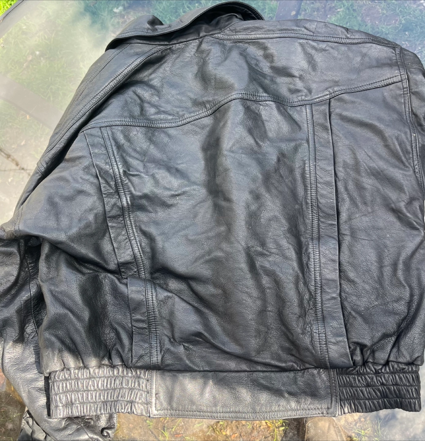 58Classic black leather jacket. Size medium. Features a snap closure and ribbed cuffs and waistband. Good used condition.