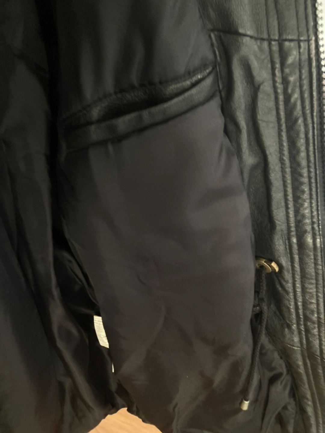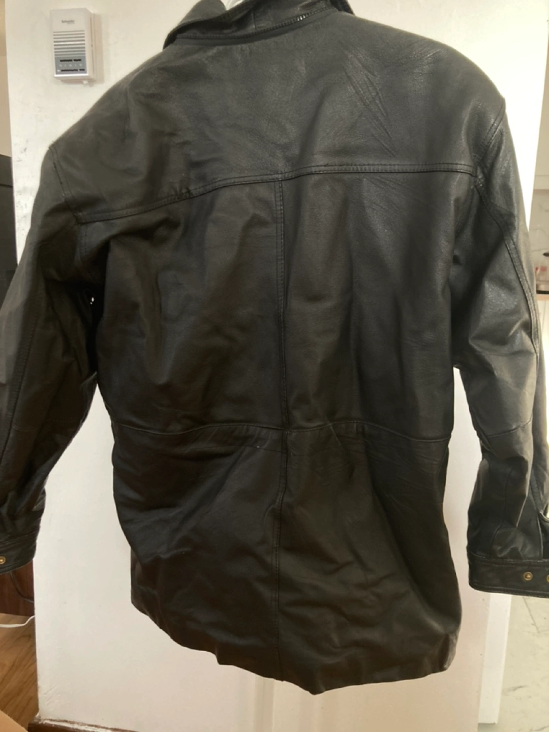 Vintage black leather jacket. The leather is dry and hard but can be revived by moisturizing/conditioning. Size Medium. Features multiple pockets and a classic design. Good condition.