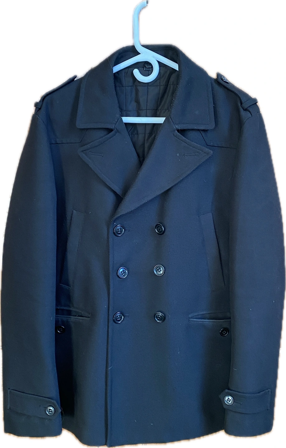 72Black peacoat with double breasted closure.
