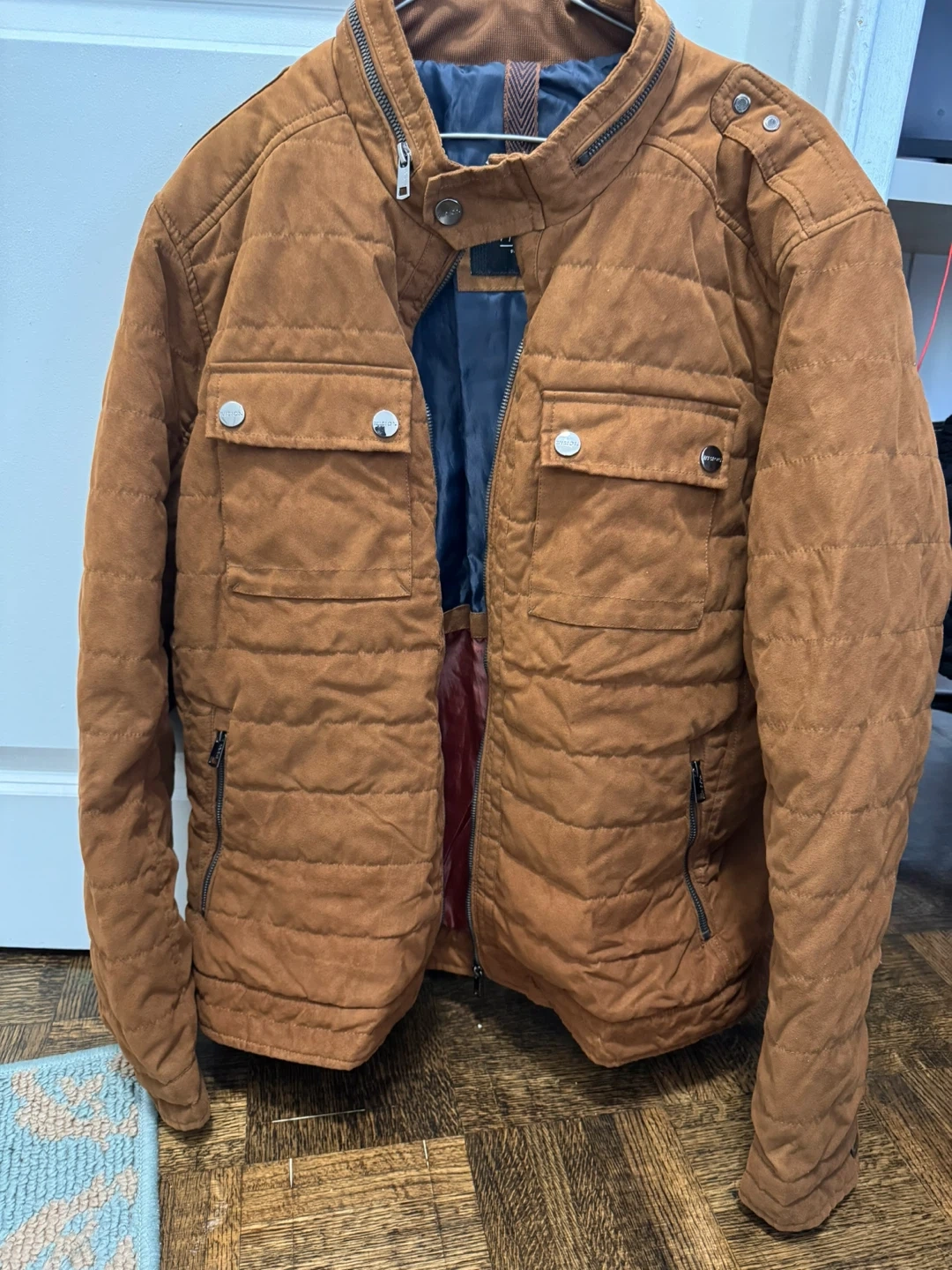 42Here's a stylish brown quilted jacket. It's in great condition and perfect for adding a touch of warmth and style to your wardrobe. The jacket features a unique quilted design and functional pockets. Size is XXL