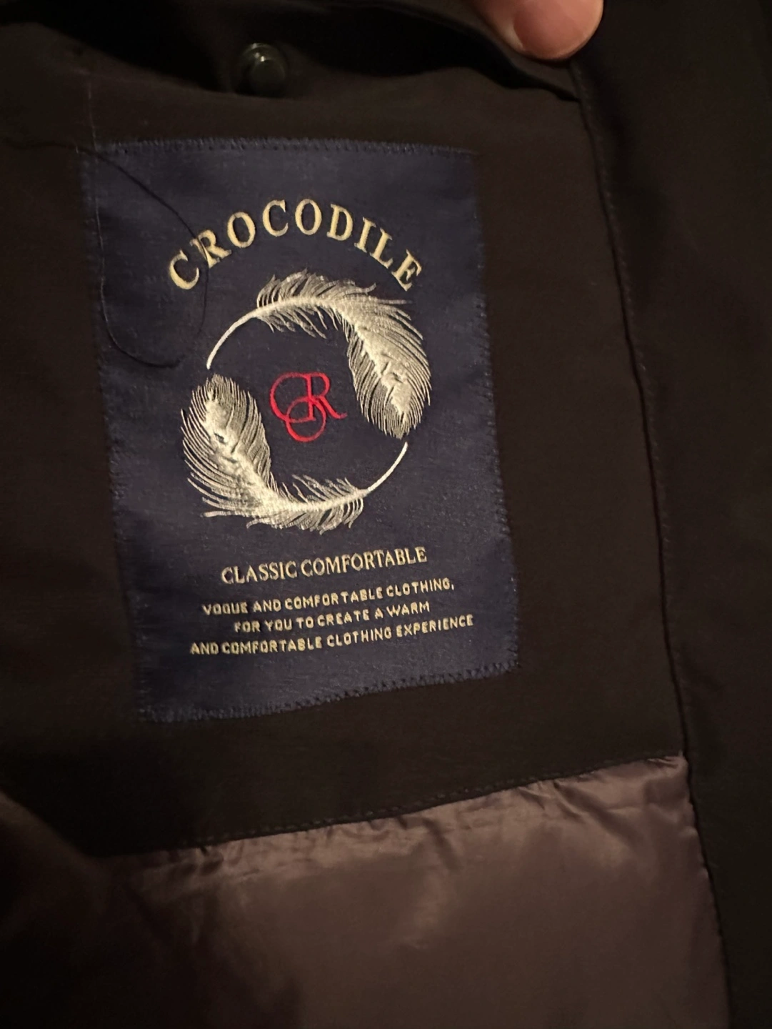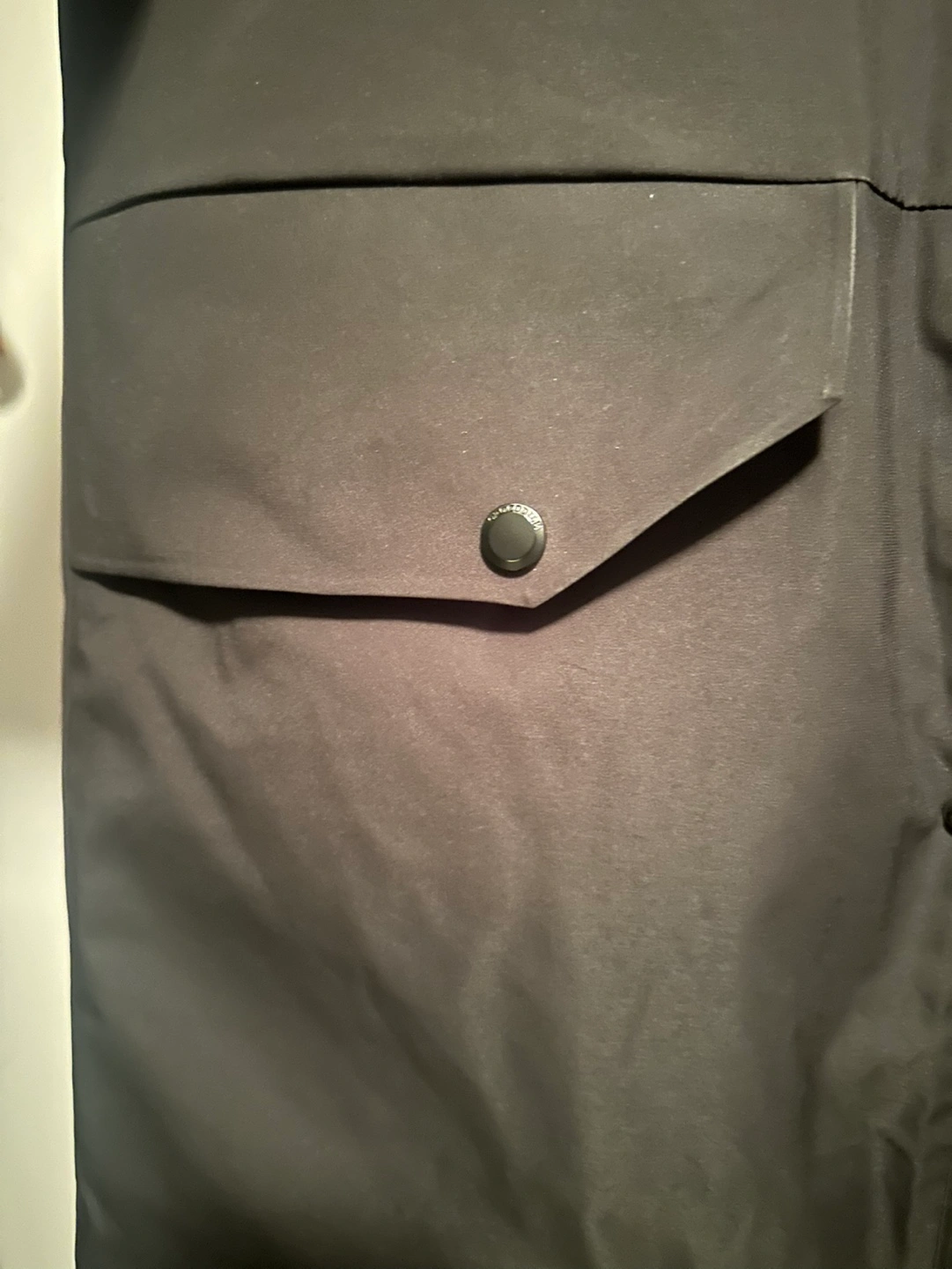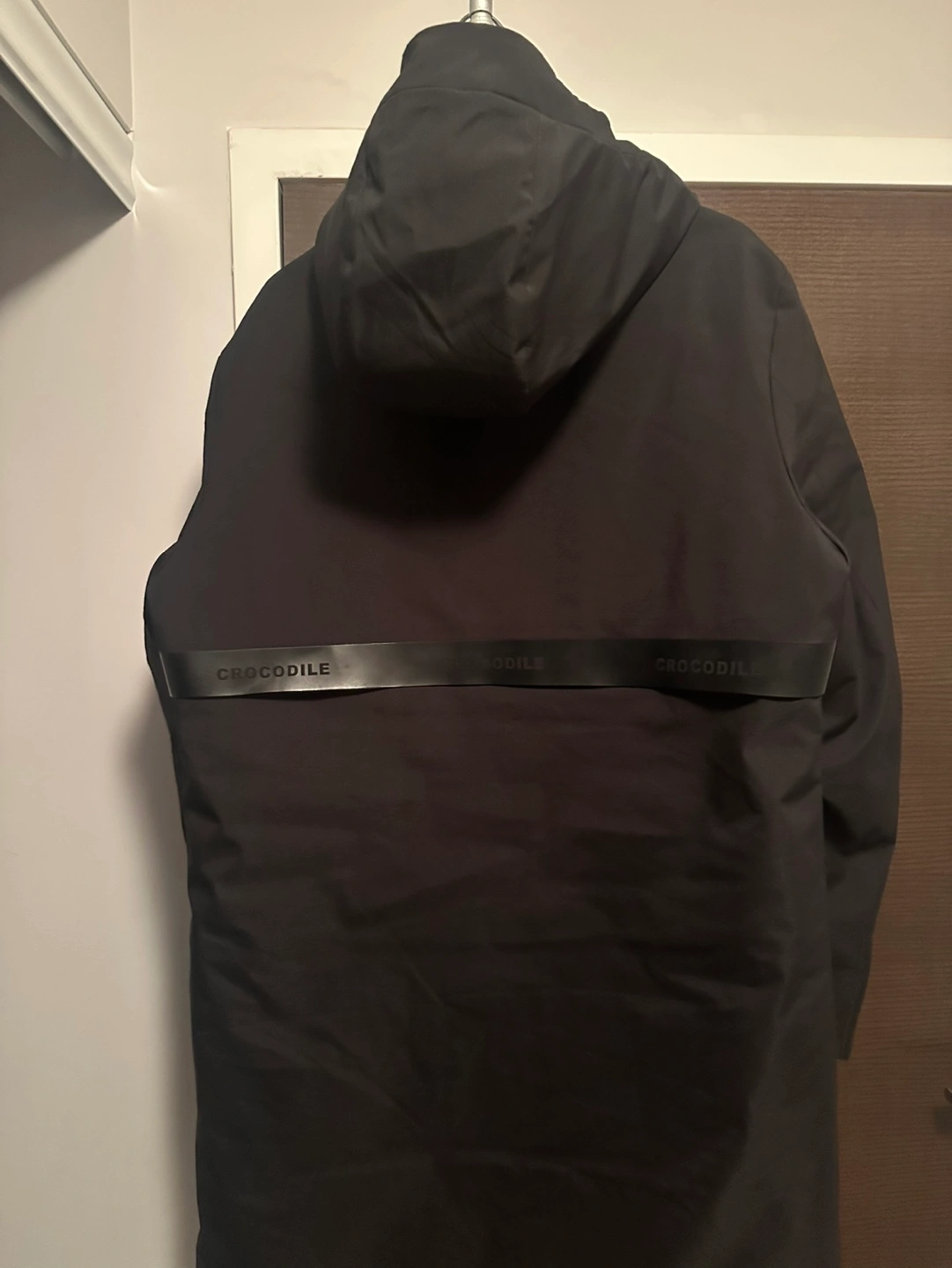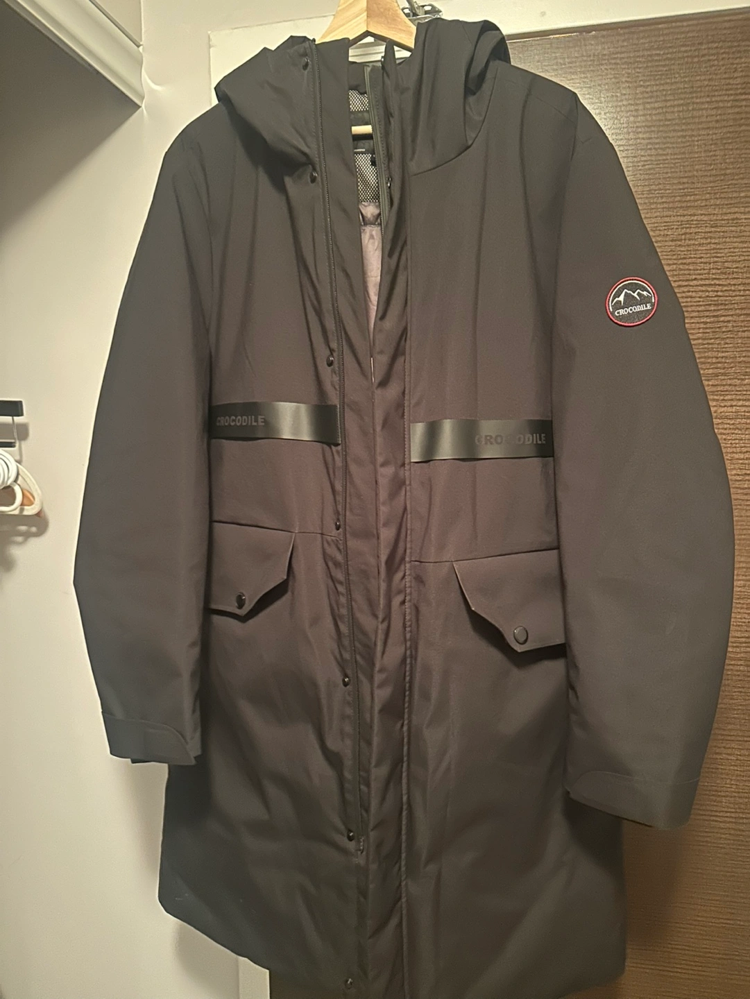 81Men's black winter parka. Long length, hooded. Features multiple pockets and a branded band across the back. Excellent for cold weather.