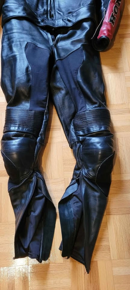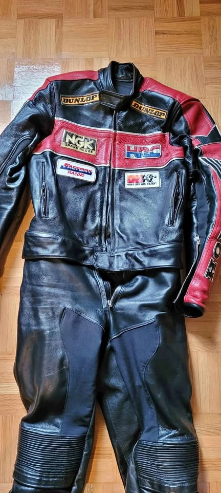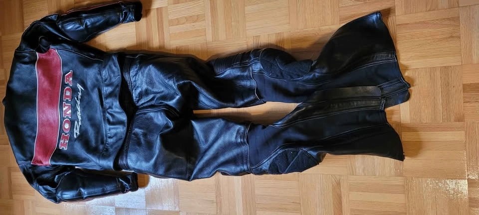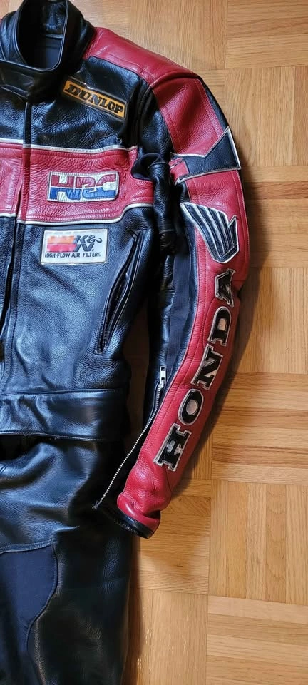 Full custom 2 piece leathers by the late great Ivan from IM Leathers. Honda racing theme. Made for tall skinny guy lol, 6-6.2ft, weight 160-170ish. The jacket has some venting with zippers on the front and there is also a removable liner for colder days. The suit is top notch with stretch panels and all the appropriate areas.