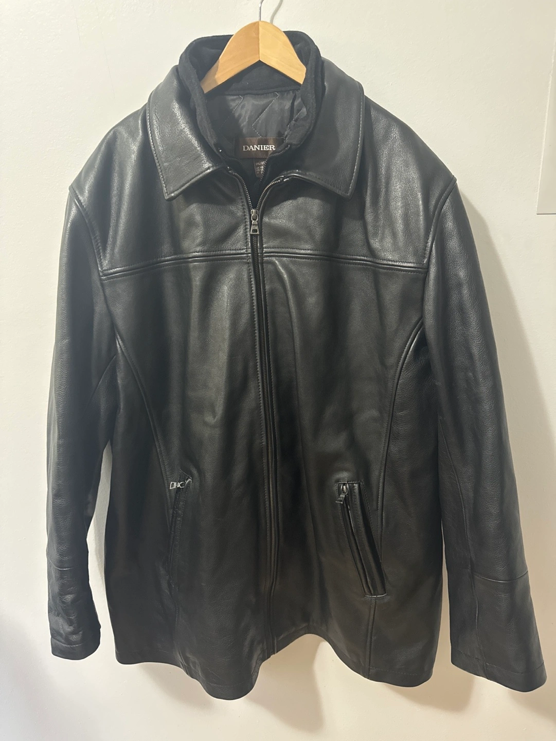 Classic black leather jacket. Zip-up front. Fully lined. Two front pockets. Size 2XL. Excellent condition.