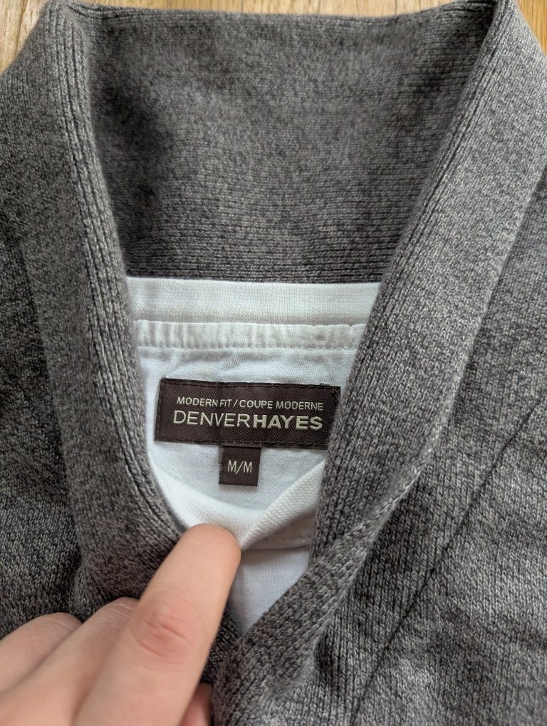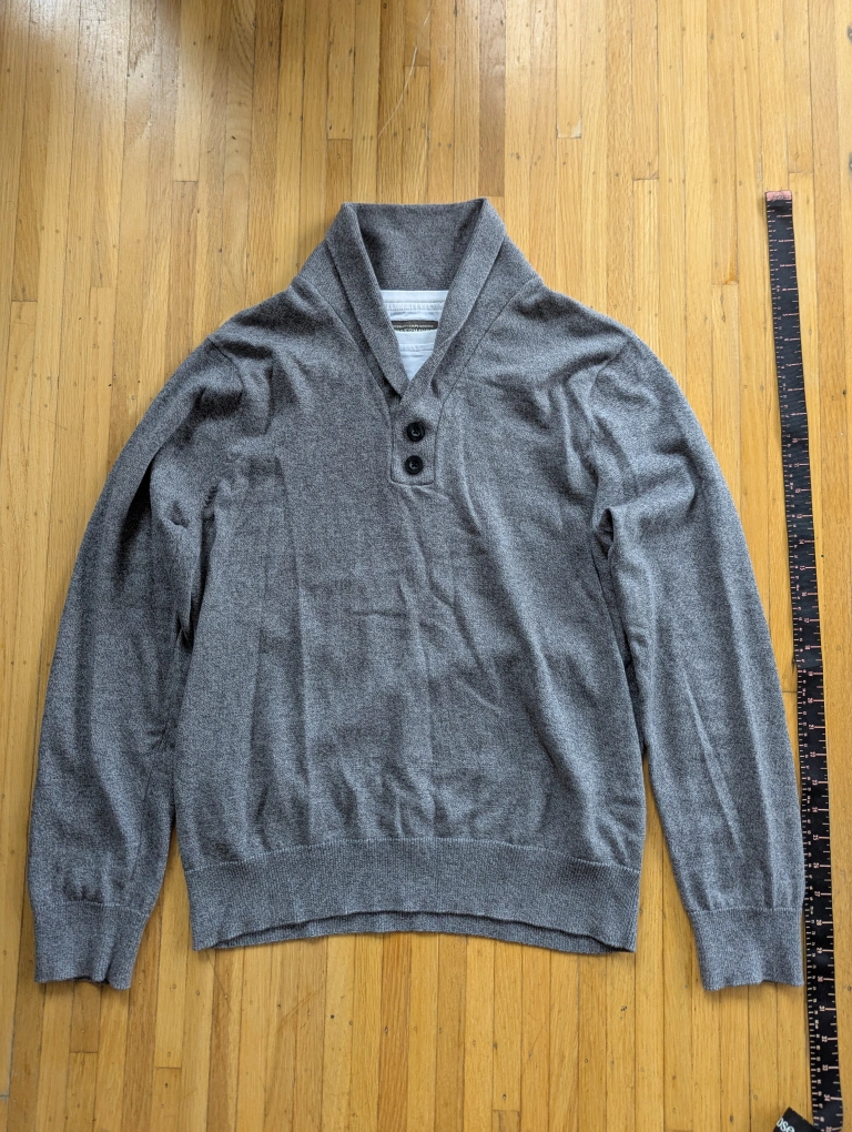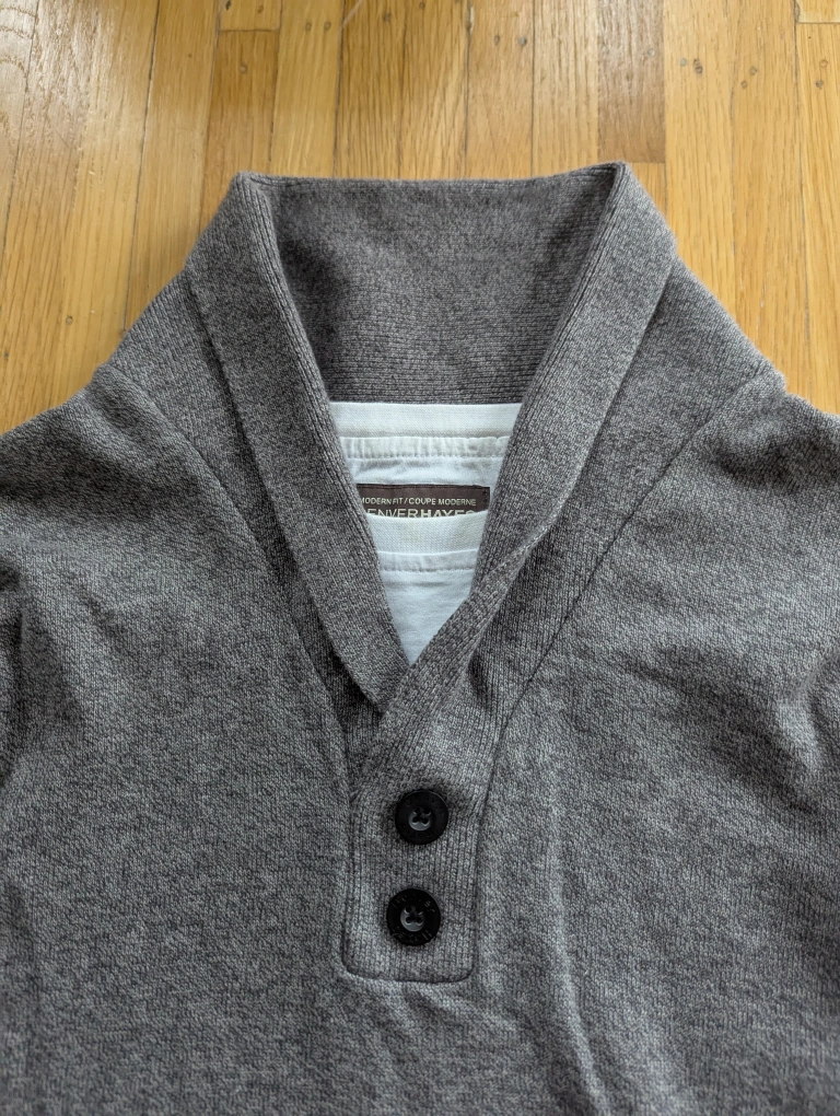 262Grey shawl collar sweater. Two button placket. Long sleeves. Medium size. 100% cotton.