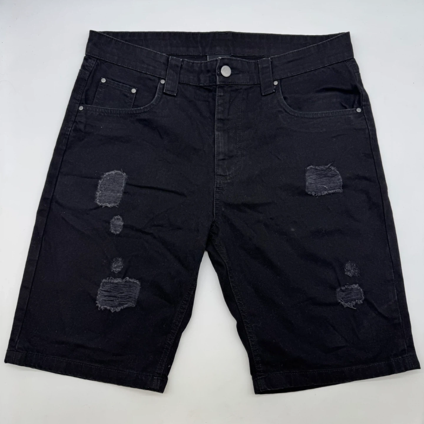 New without tags — Men's black denim shorts with distressed ripped details on front and back. Made from 100% cotton, comfortable and stylish for everyday wear. Classic 5-pocket design, button and zip closure. Size: • US 34 • EU 44 • UK 34 • Waist: ~86 cm • Length: ~23 in • Leg opening: ~10.5 in Not vintage - modern streetwear look. Pickup in North York Delivery available for extra CL21