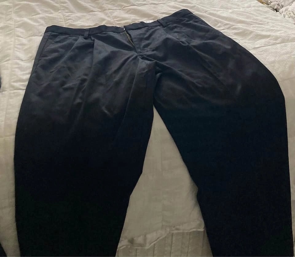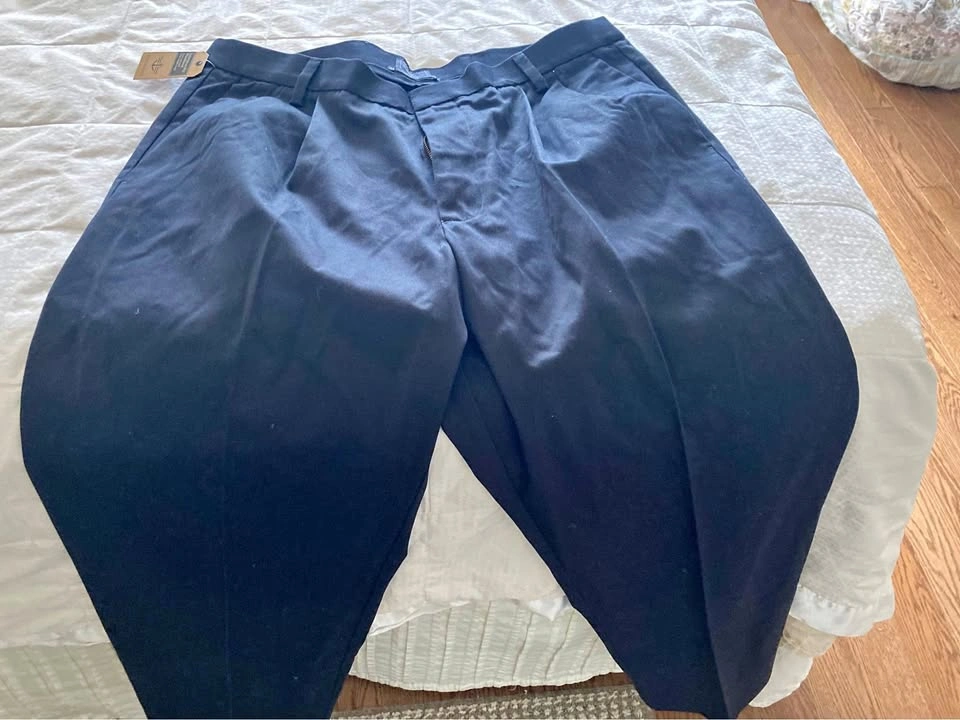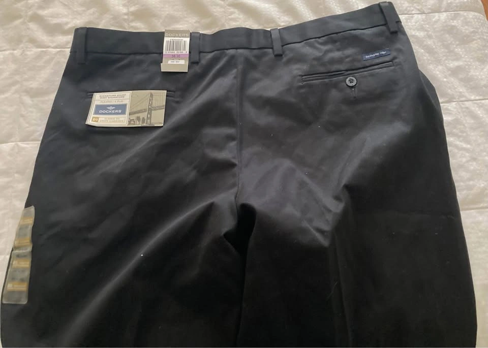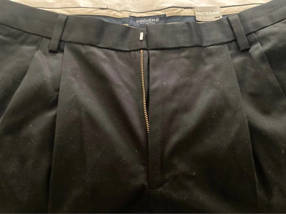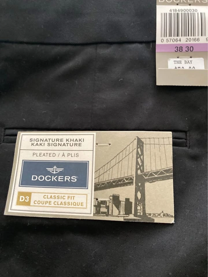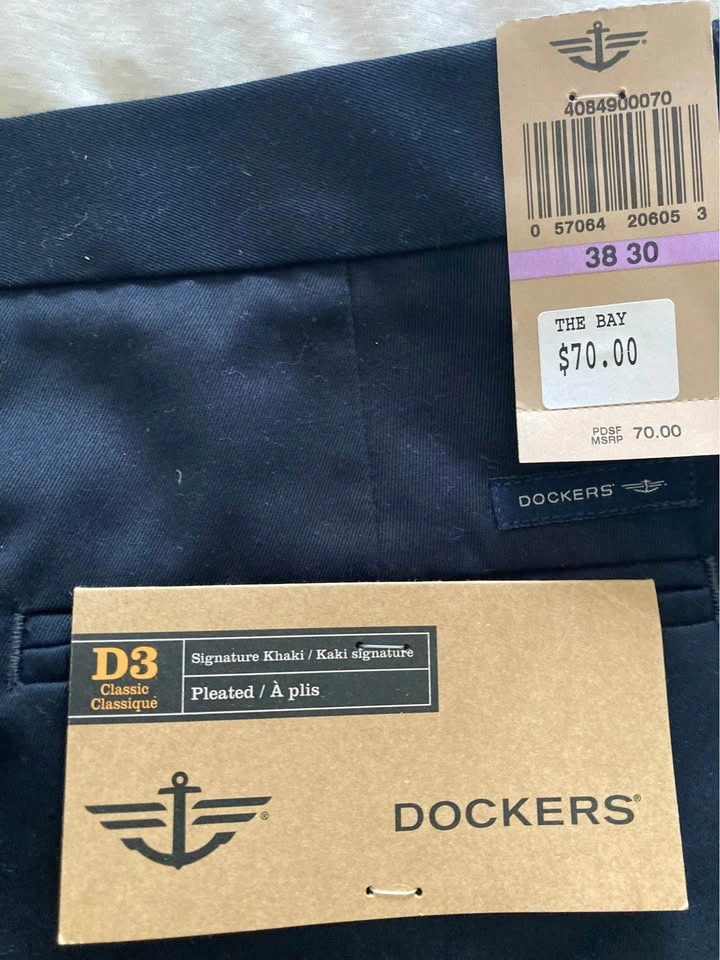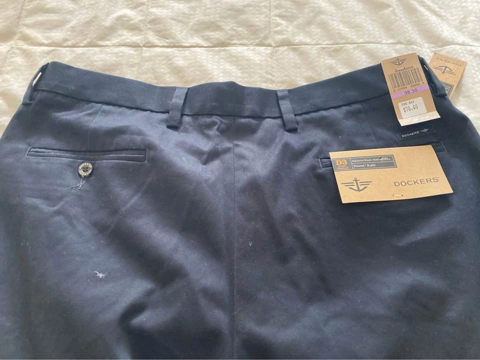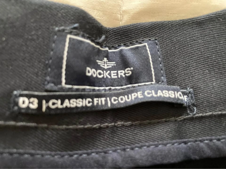Two pairs of Navy Men’s Dockers Pants (“38x 30”) are brand new and come with tags. These Men’s Dockers pants are a classic fit, 100% cotton and double pleated. One Black Pair of Dockers in black at “38x 30” is also available. Pick up only. Cash only.