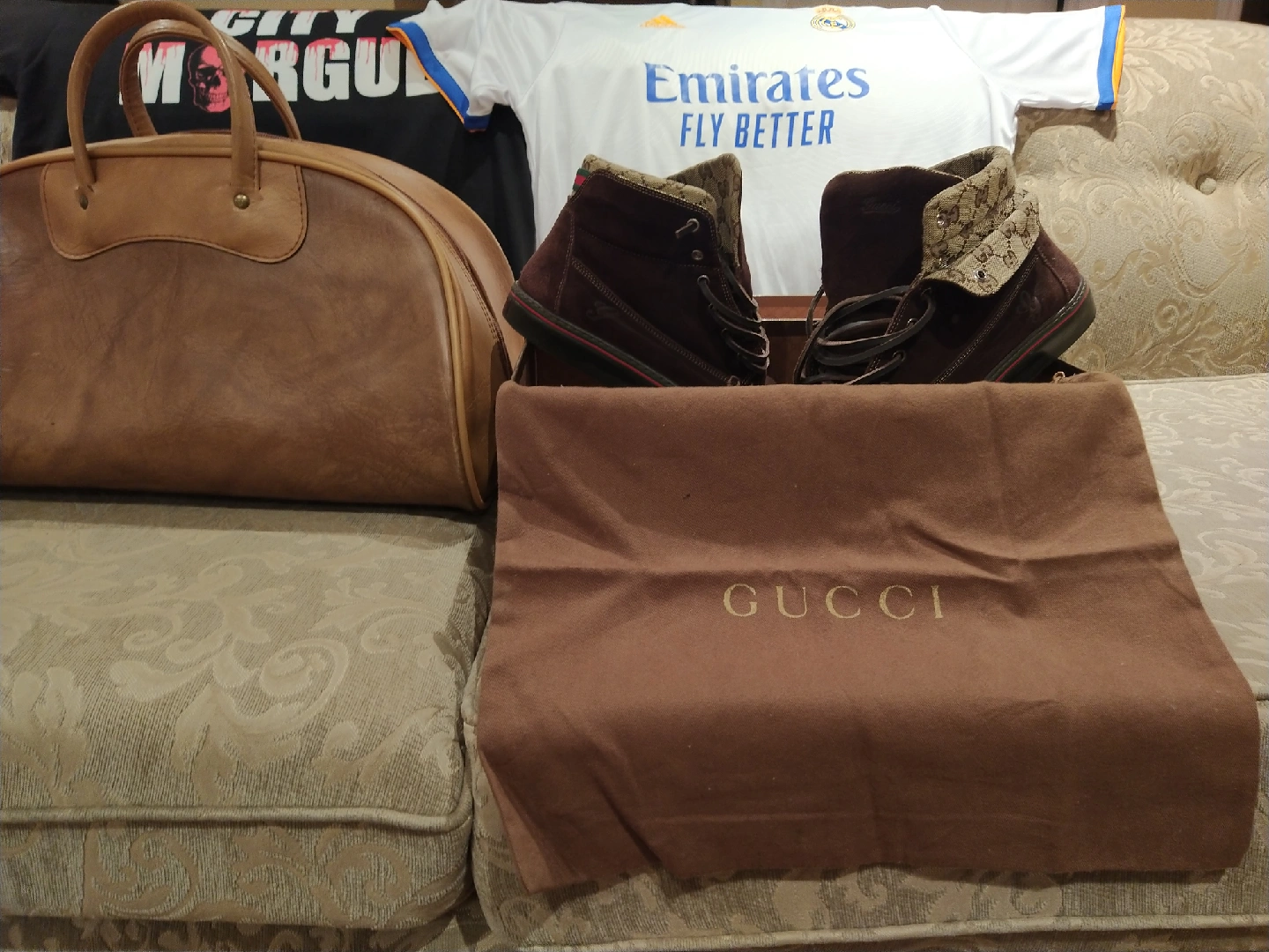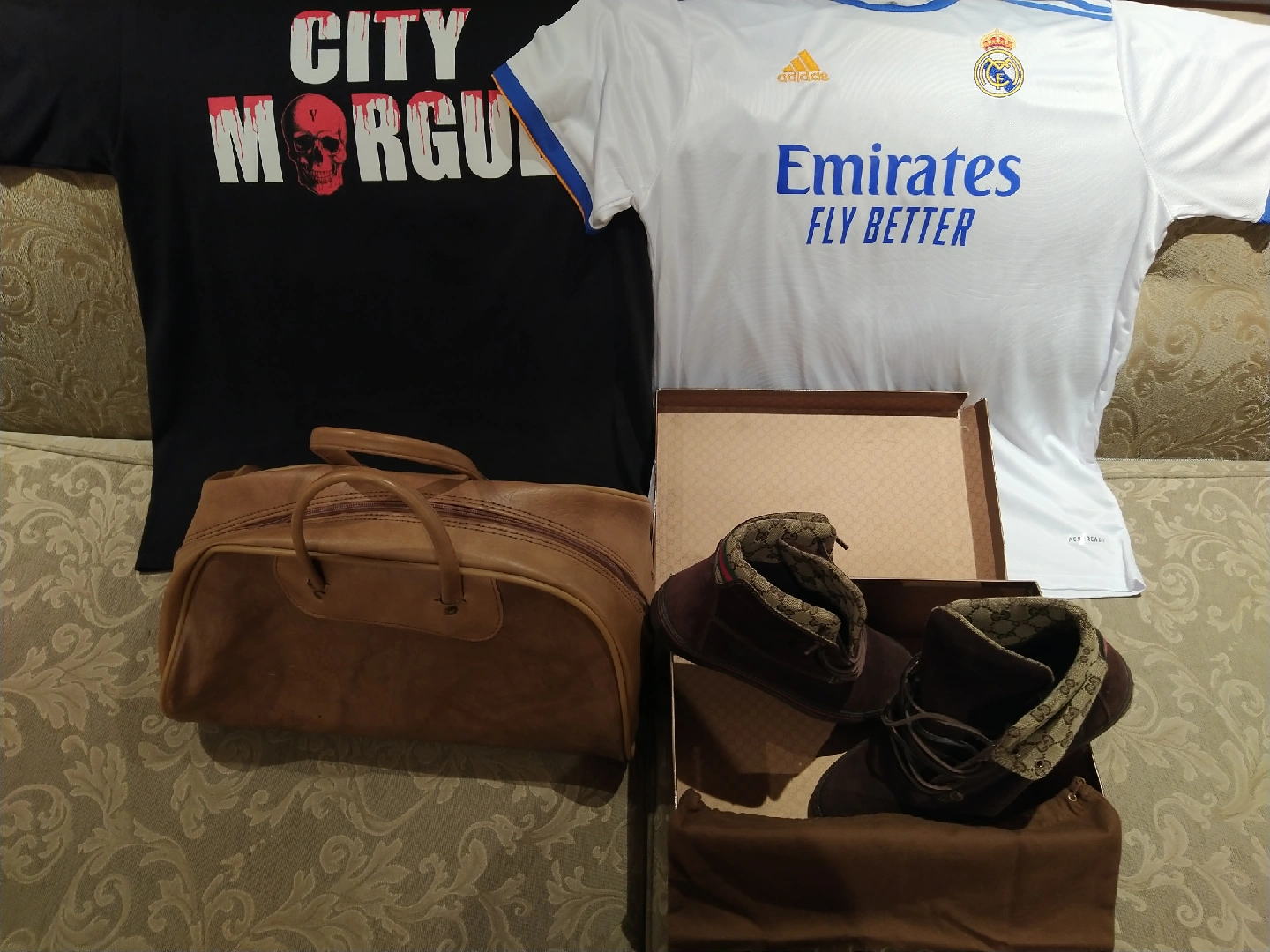 4 fashion items of varrying scales from casual to designer. 1: Adidas mens XXL (waers like a XL)real Madrid jersey 2:National Luggage men's doctors duffle 3:VlonxCityMorgue XL t - shirt 4:Mens Size 10 Gucci sneakers