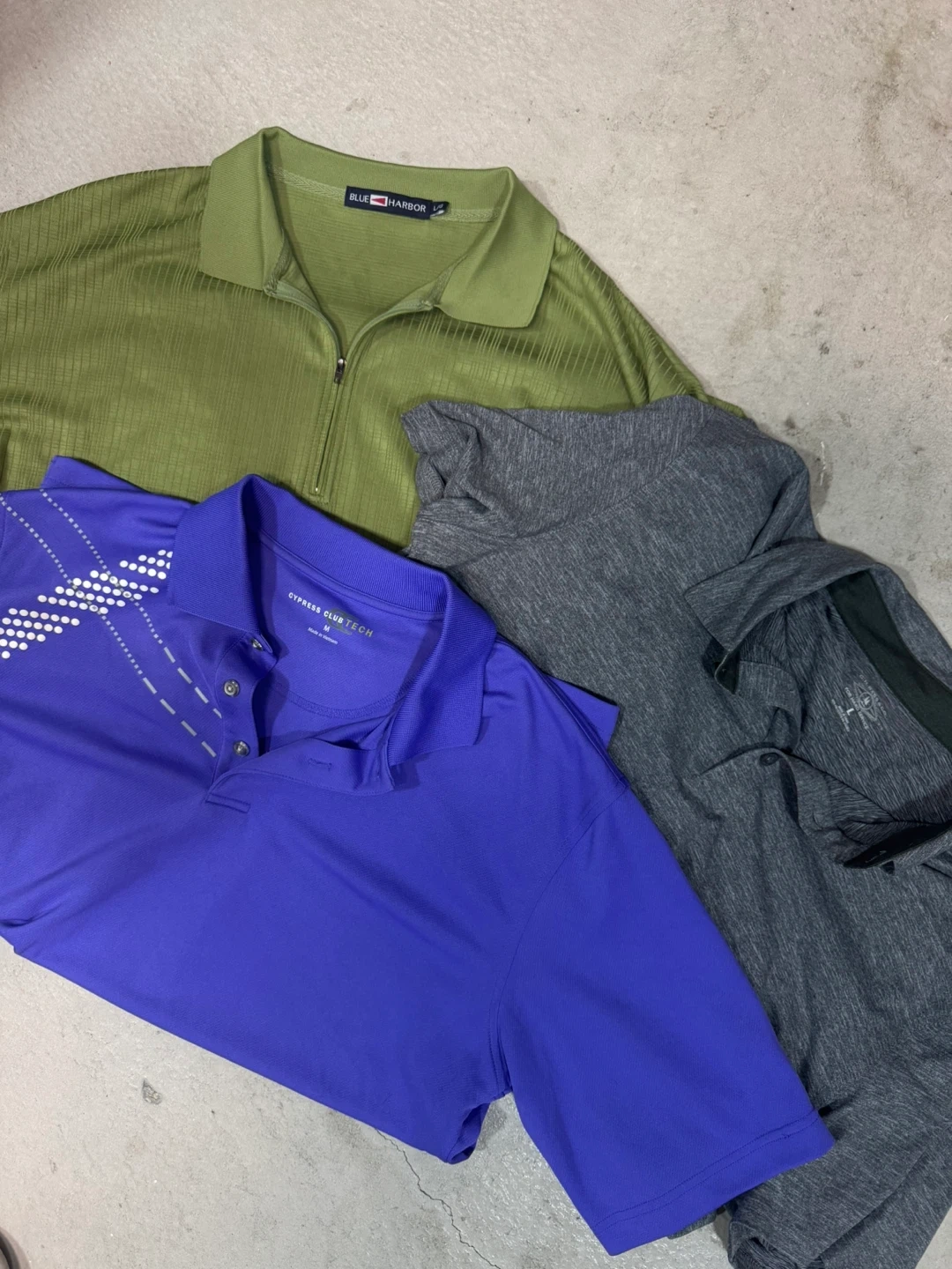 22Selling a set of men's golf polos in great condition! Includes: - Blue Harbor polo (olive green) - Cypress Club Tech polo (purple, size M) - Under Armour polo (grey)