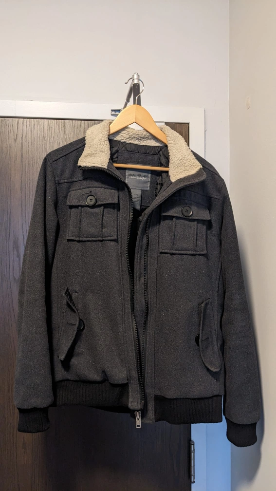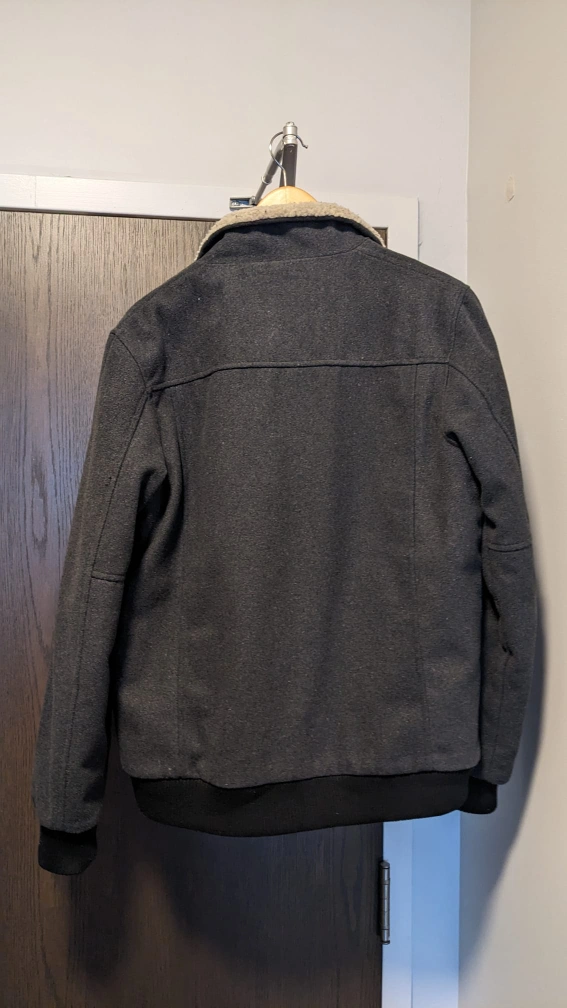 98Men's jacket. Has pockets on the front and a zipper closure. It has a black knit band around the cuffs and waist.