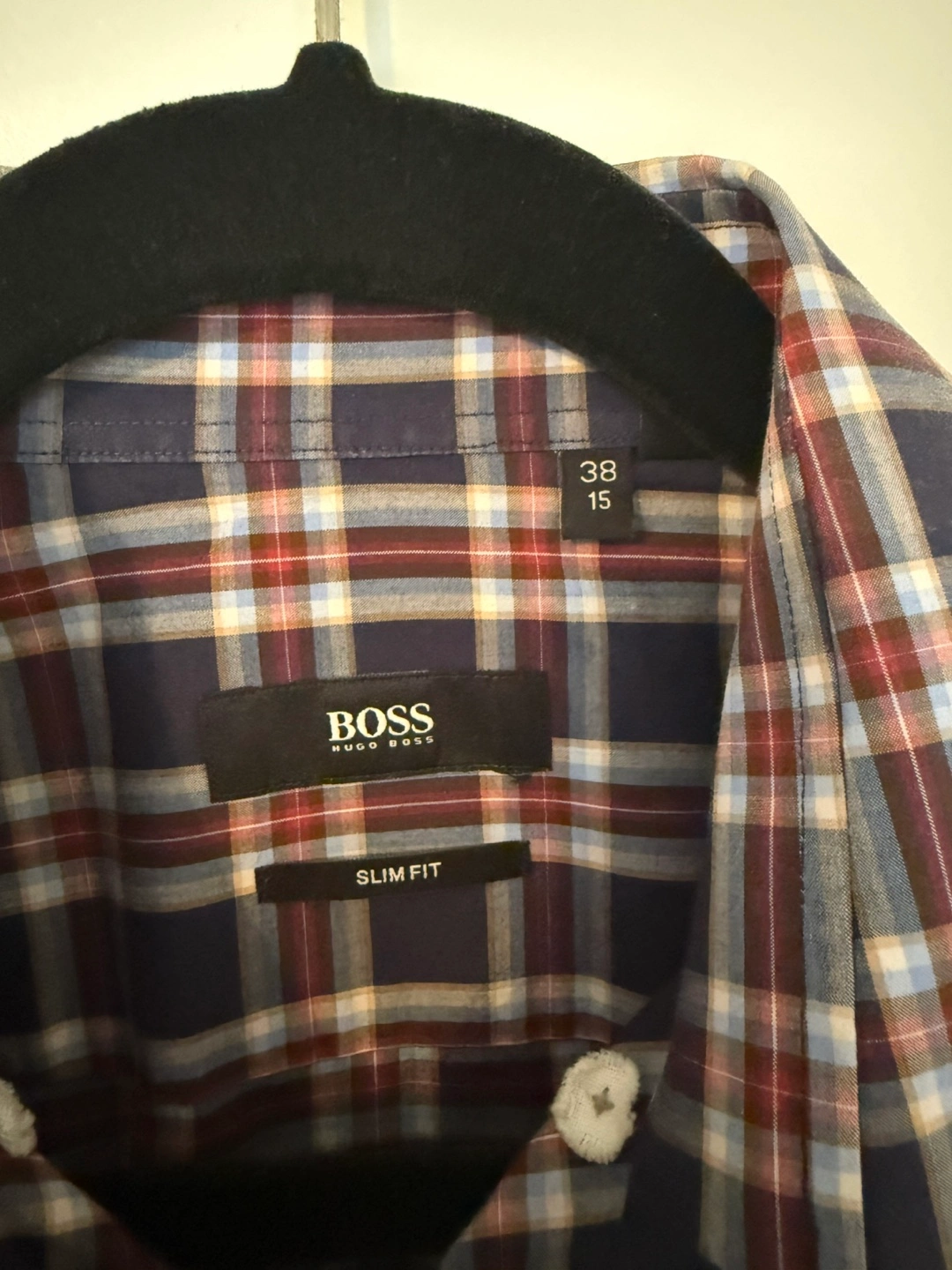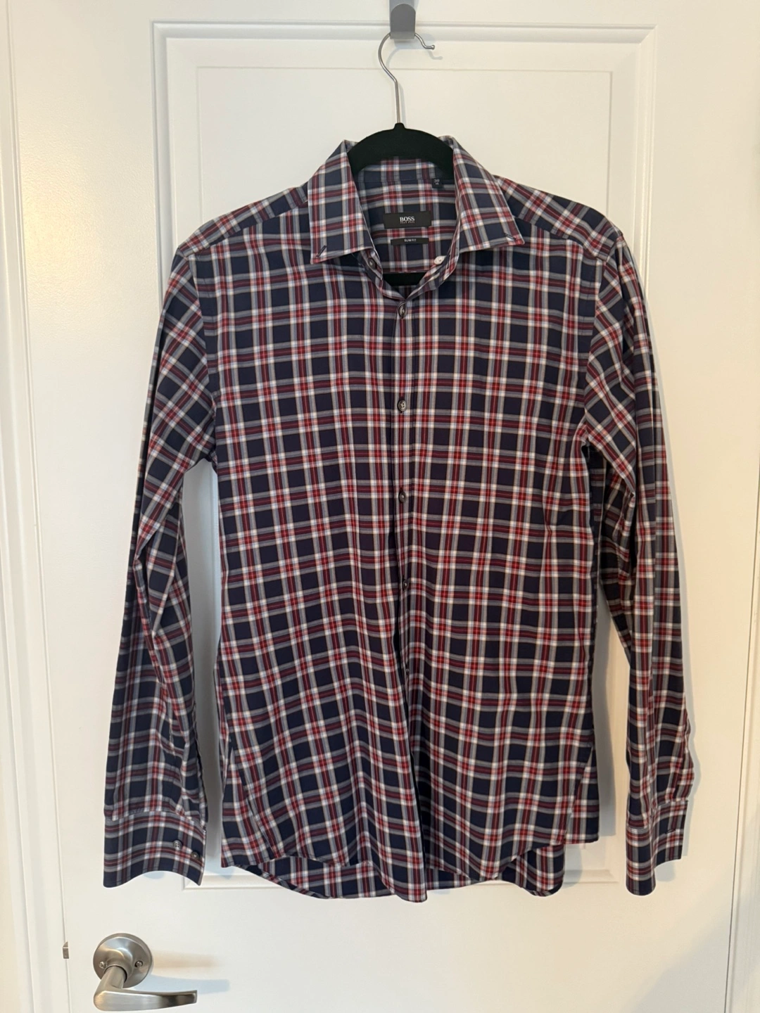 Men's long-sleeve dress shirt. Slim fit. Blue, red and white plaid pattern. Size 38/15.