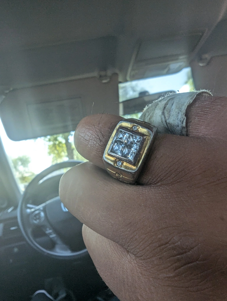 A men's ring with a square face and what appears to be cubic zirconia or similar stones. The band is gold-coloured, and the face has a silver-coloured setting. it's gold plated. Size 12.only cash accepted Thank you have a good day!!