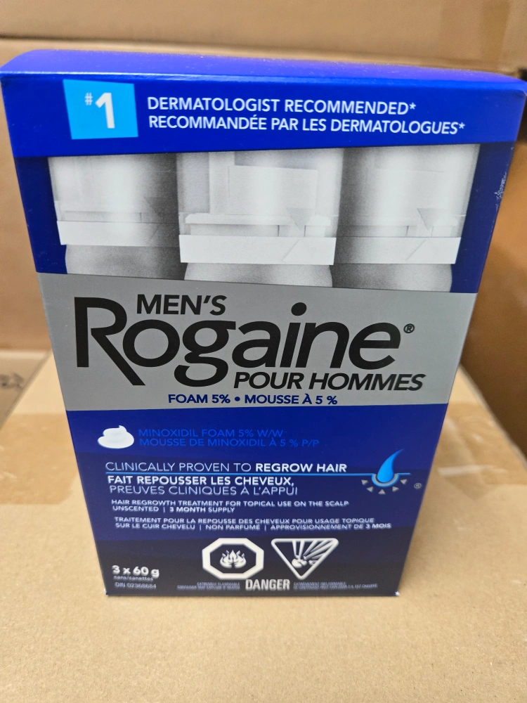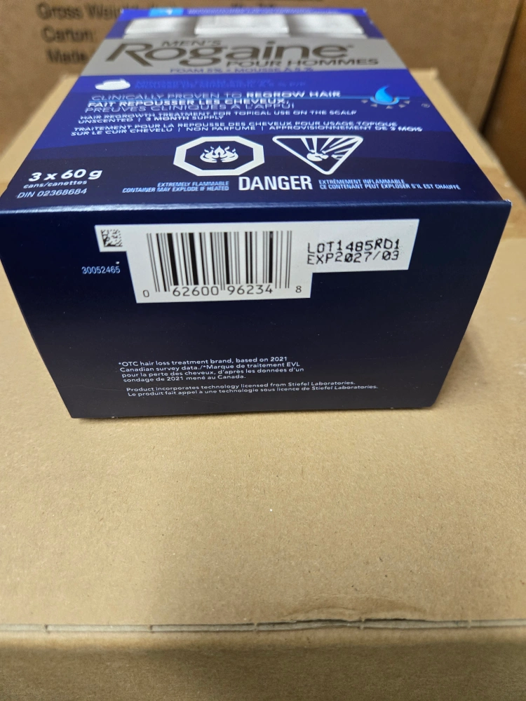 Selling a box of Men's Rogaine Foam 5%, a hair regrowth treatment. Each box contains 3 x 60g cans. The expiration date is March 2027. It's dermatologist recommended!