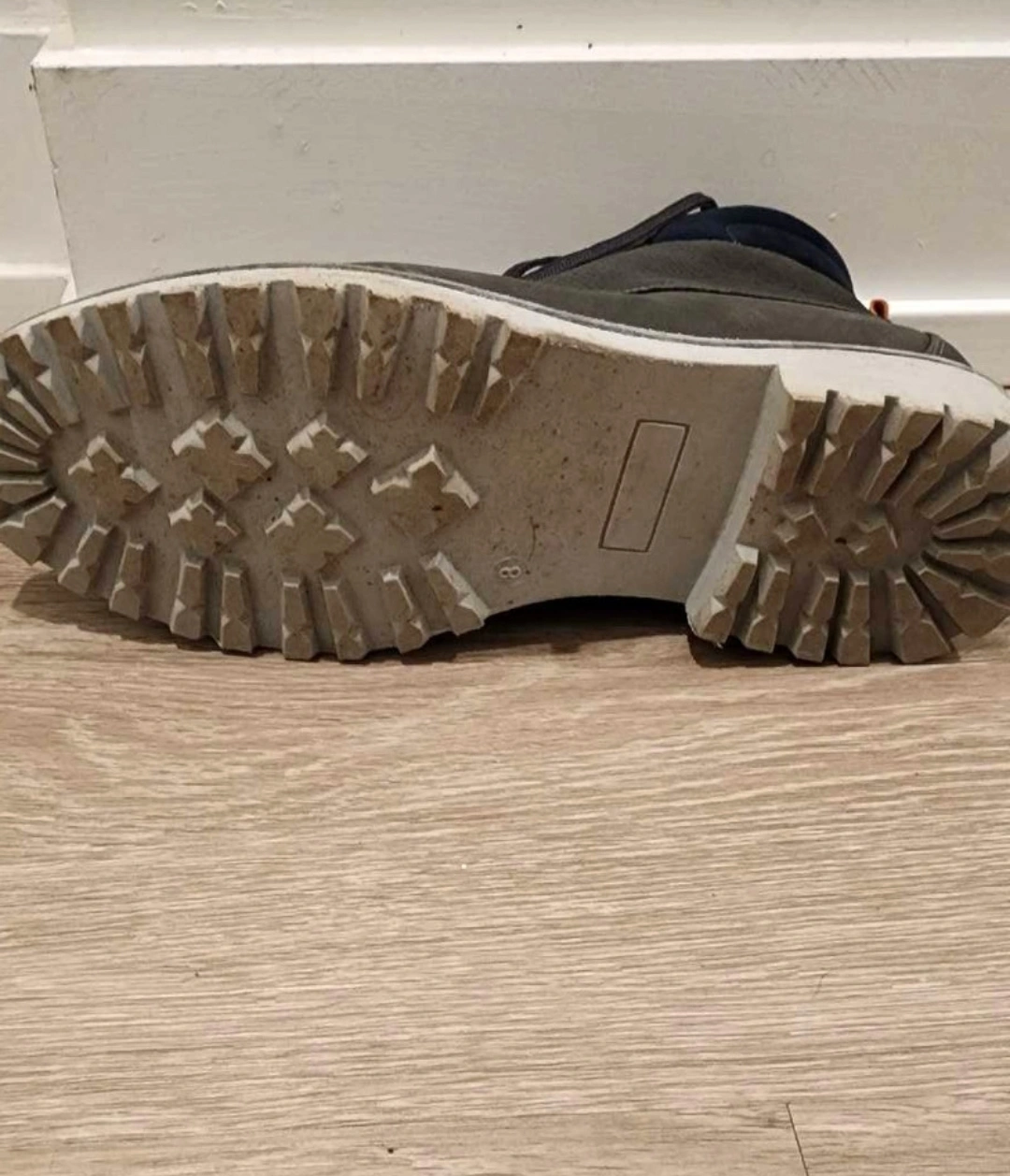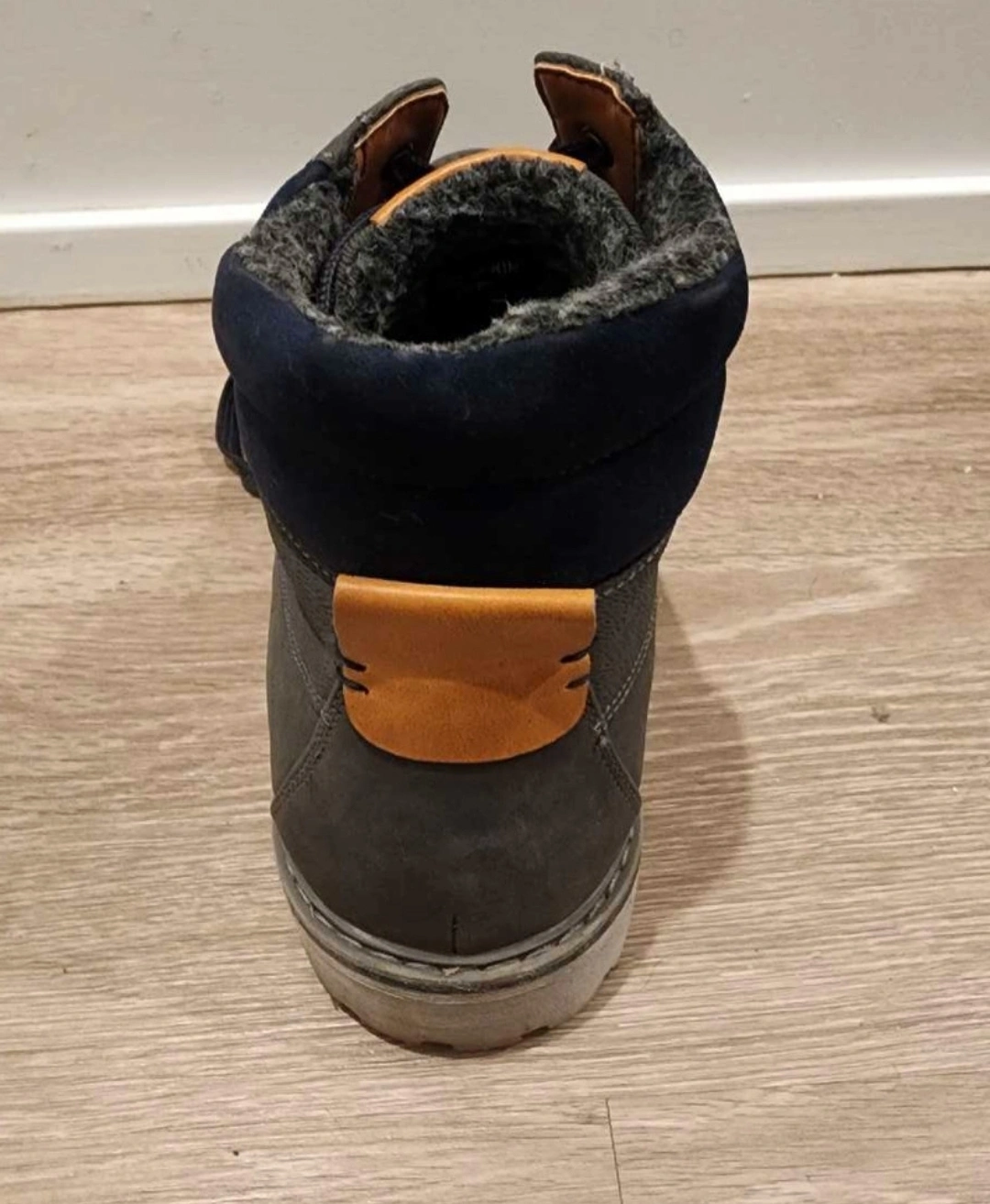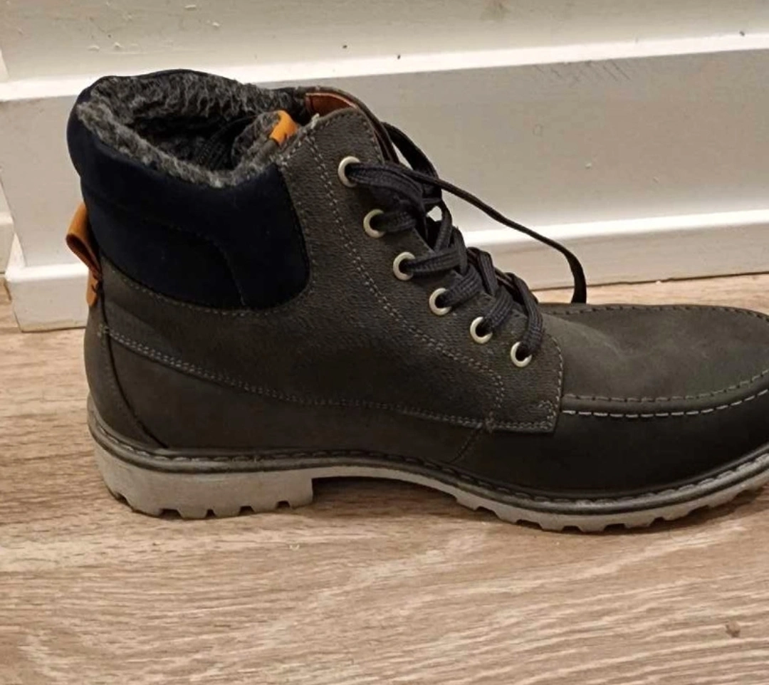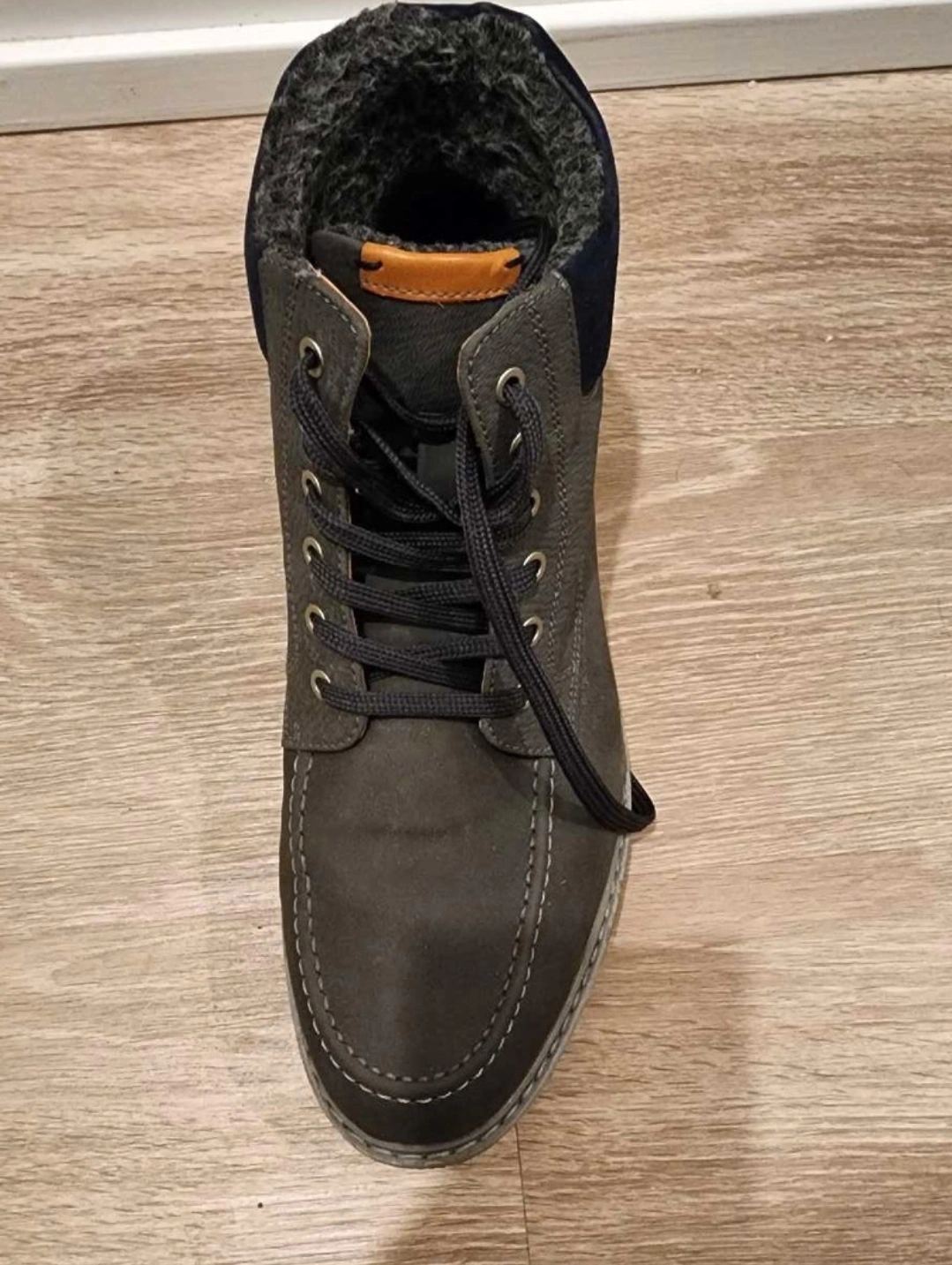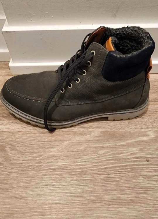 Men's ankle boots. Dark grey suede-like material. Lace-up closure. Warm, fuzzy lining. Grey and white sole. Size 8.
