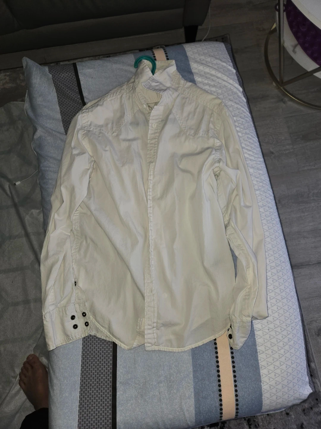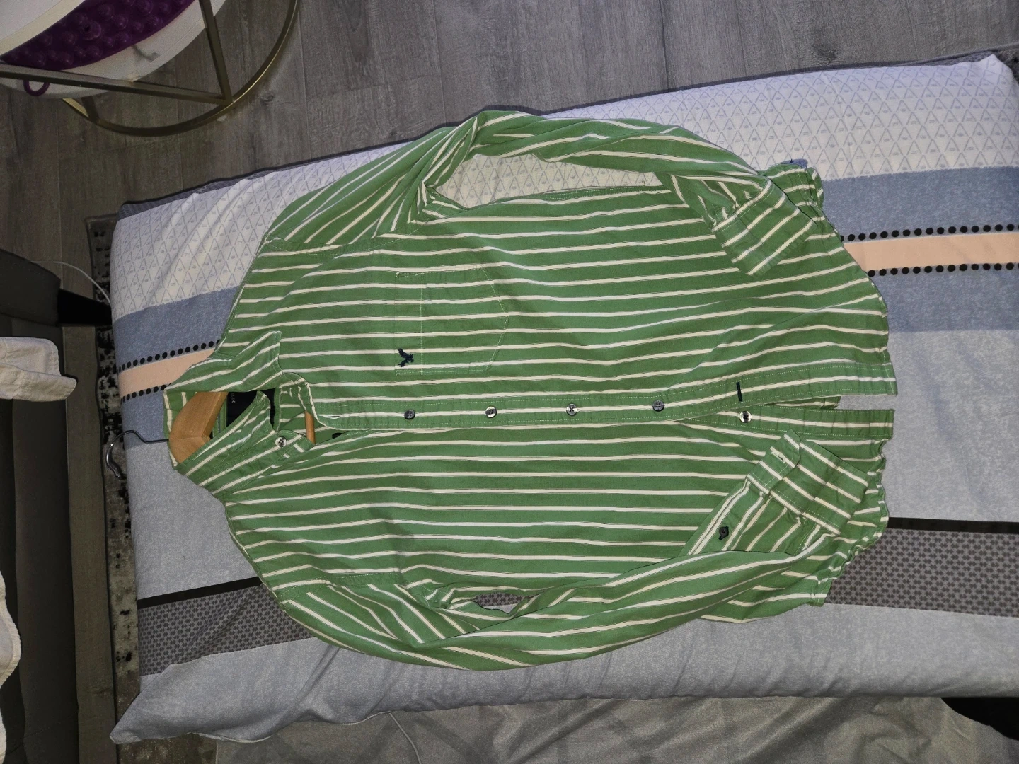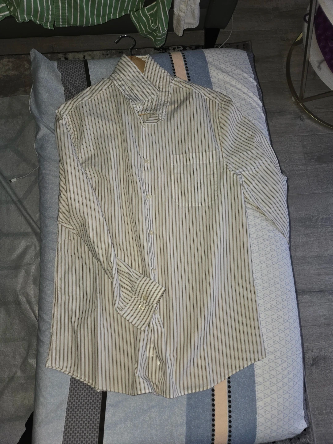 207A collection of men's long sleeve shirts in various striped patterns. These shirts are perfect for casual wear and are in good condition. They are ready to be added to your wardrobe! 4 for $15 cash
