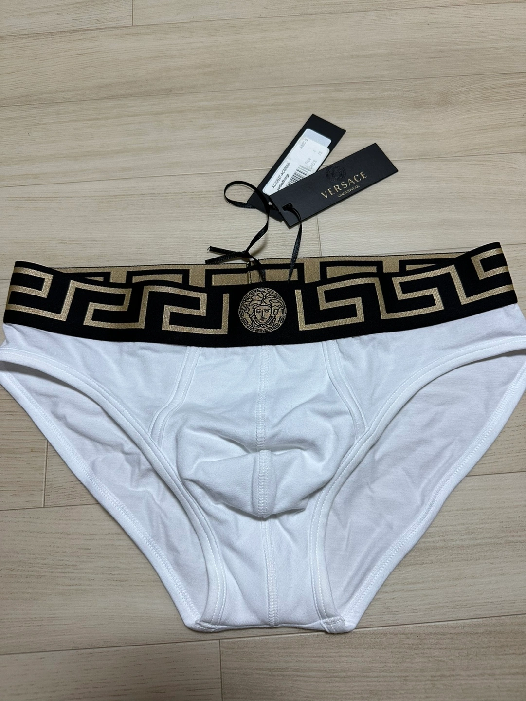 New with tags. Men's size medium white cotton slip. Features gold Greek key design. Comes in original Versace packaging.