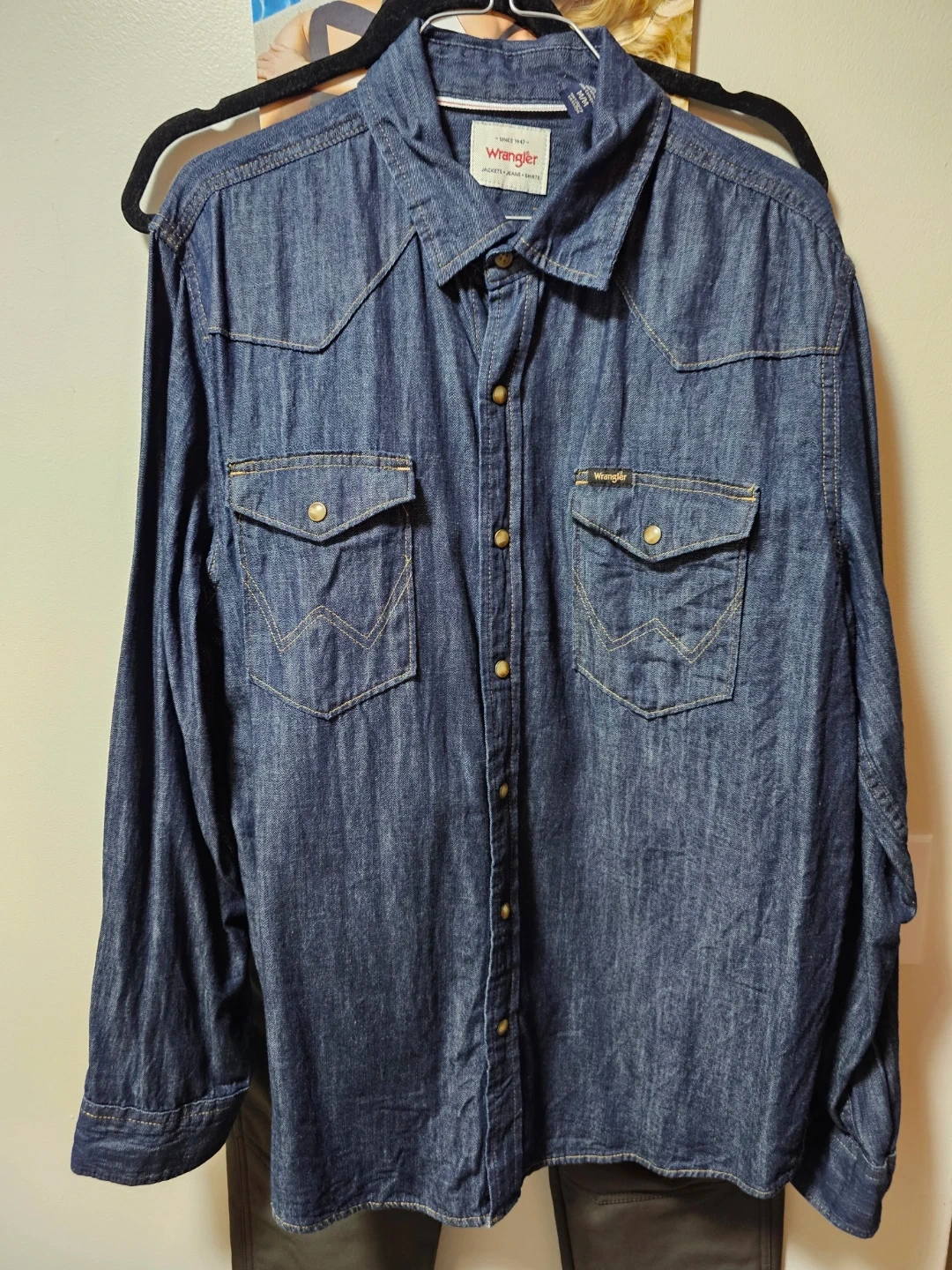 10Selling a men's Wrangler denim Western shirt. It's in great shape and ready for a new home! wrangler mens denim long sleeve shirt 40$ medium new caterpiller small shoulder bag new 40$ mens soft shell inner fleece pants 3 Available grey green kakhi 20$ each new 36 waist by 30length texfit summer zip up hoddies 2pack for 20$ white and gray new medium mac tools yellow hoddie medium 40$ new scott ellis blue hoodie 40$ new medium caterpillar new adjustable hat 10$ champion s/m flex fit hat 10$ new flexfit bronze cap s/m 10$ new Armani Exchange white watch with box 60$ wrangler black denim shit 20$ large brown Levis 4 pocket cotton jacket with removable hood new 80$ medium light brown Levis 4 pocket cotton jacket with removable hood 60$ medium point zero/ project raw removable hood suit jacket large size 80$ outbound large fleece zip up 10$ new Unique bella white long rain jacket 40$ waterproof Generic medium blue bomber jacket 20$ new Ripzone medium blue filled plaid jacket 20$ Ripzone medium filled white plaid jacket 20$ levis green canvas bomber jacket medium new 80$ generic black jean jacket with removable hood 20$ Creed movie bomber wool/leather jacket xl 60$ levis soft shell inner fleece blue bandana jacket new 60$ DKNY long winter coat I can meet you half way depending on where you live ALSO FLEXIBLE ON PRICE