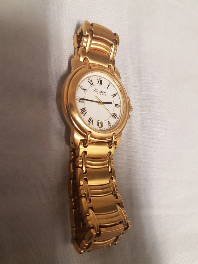 15Kolber Geneve Brand. Water resistant Sapphire Crystal. 18K Gold, electroplated. Battery operated with date feature. Great condition. Available for pickup near Cambie Road & No. 5 Road in Richmond.