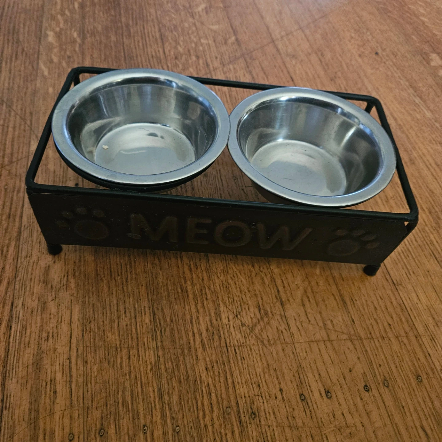 15This is a MEOW pet double diner! It's perfect for cats. It features two stainless steel bowls in a black metal stand with the word 'MEOW' and paw prints. It's in great condition and ready for a new home for your furry friend