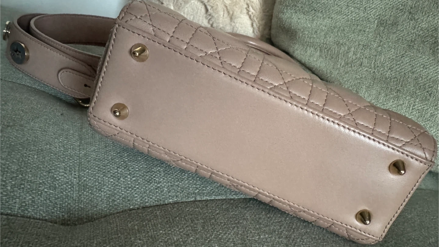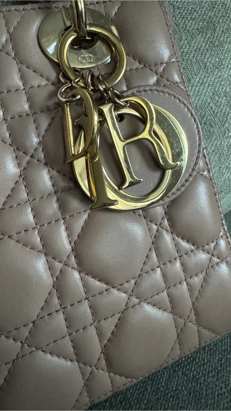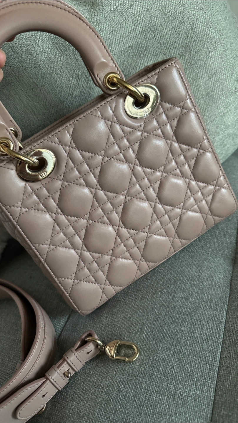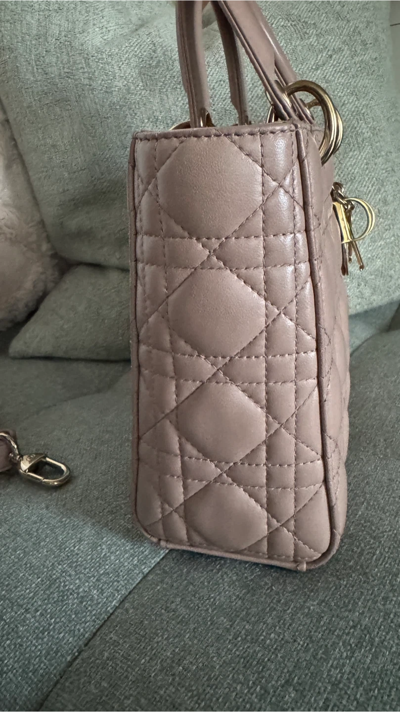 Classic Dior Lady Dior bag in a dusty rose colour. It's made from quilted lambskin leather with gold-tone hardware. The iconic 'D.i.o.r.' charms are attached.