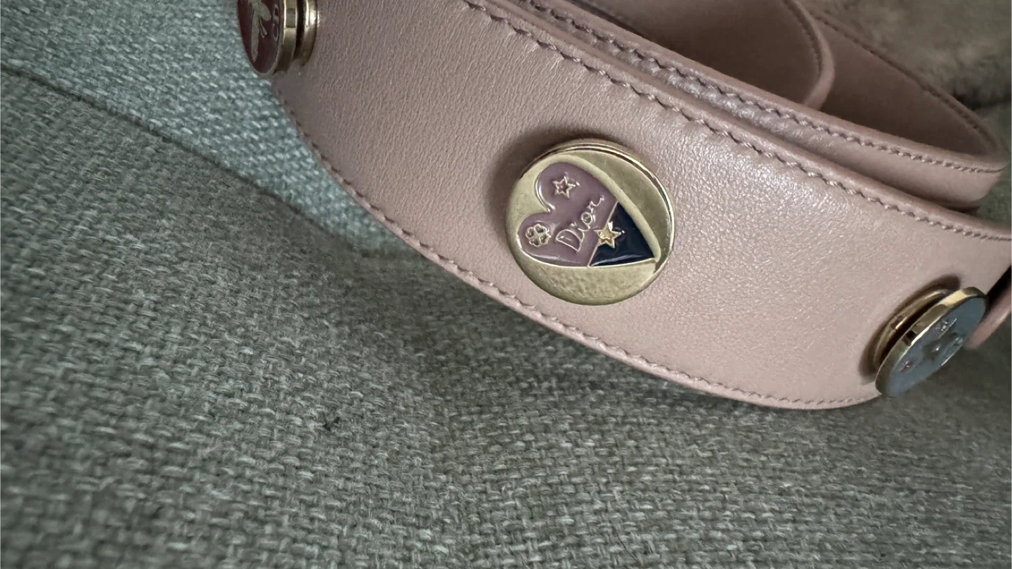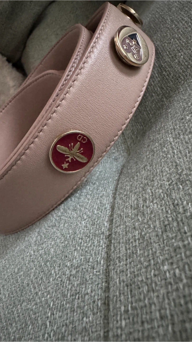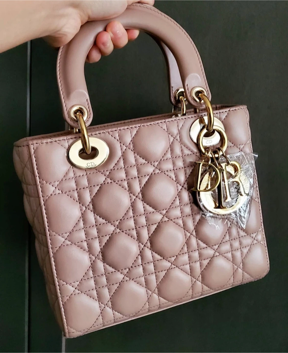Classic Dior Lady Dior bag in a dusty rose colour. It's made from quilted lambskin leather with gold-tone hardware. The iconic 'D.i.o.r.' charms are attached.