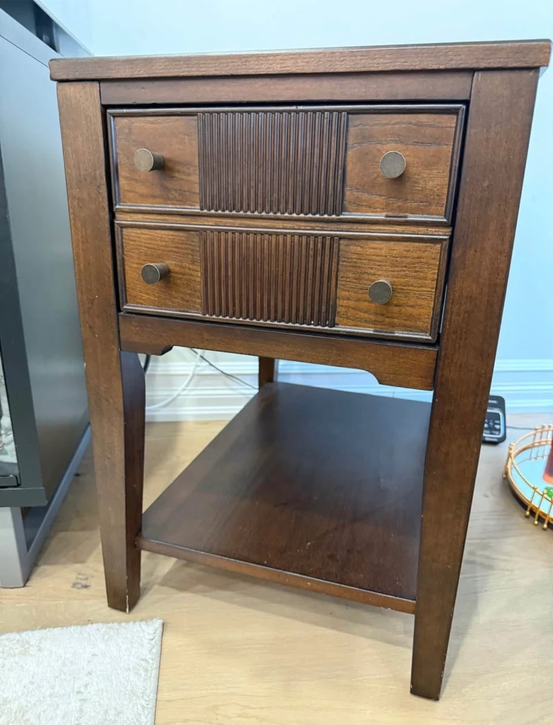 10Selling a matching coffee table and end table set. Both tables are made of wood with a dark brown finish. The coffee table has a glass insert and a shelf for storage. The end table has two drawers and a shelf. They are in excellent condition and would look great in any living room!