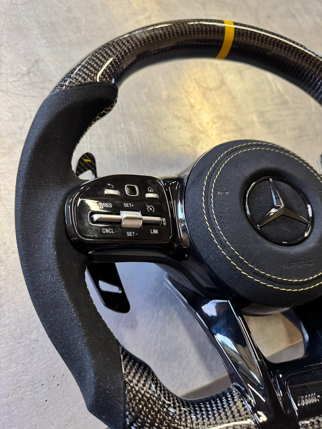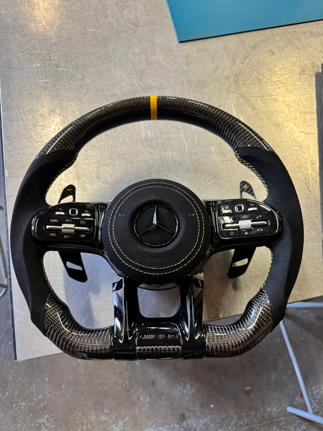 Selling a brand new Mercedes-AMG performance steering wheel! It features carbon fibre detailing, yellow stitching, and paddle shifters. The wheel is in great shape and would be a stylish upgrade for your ride