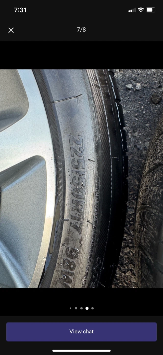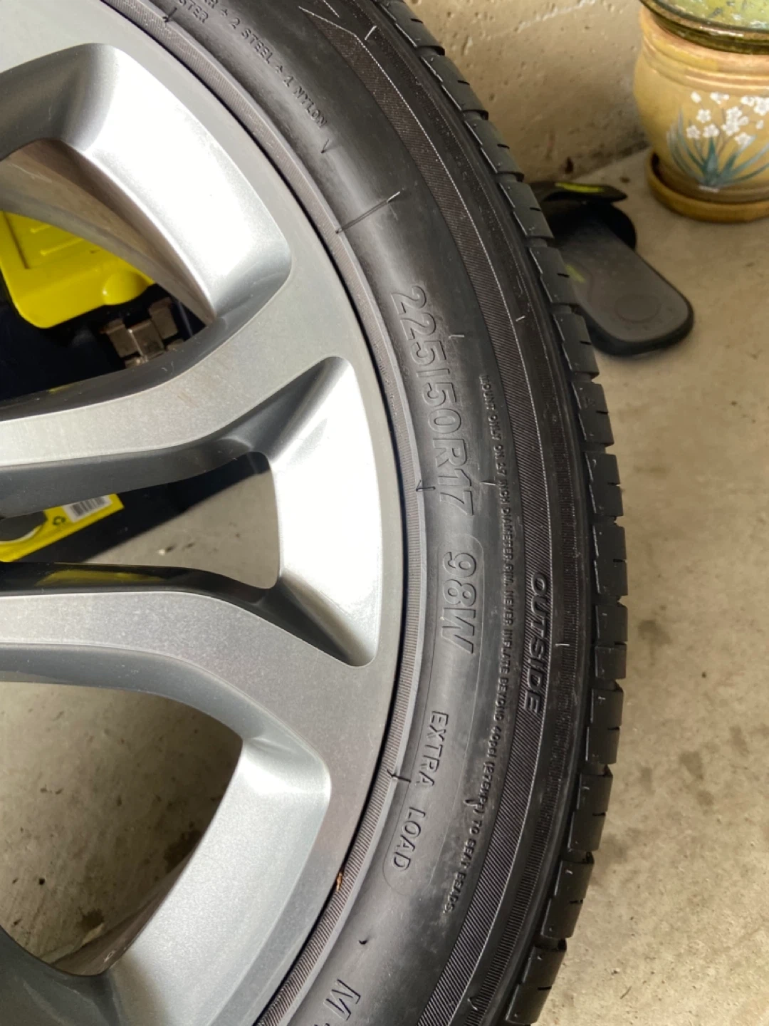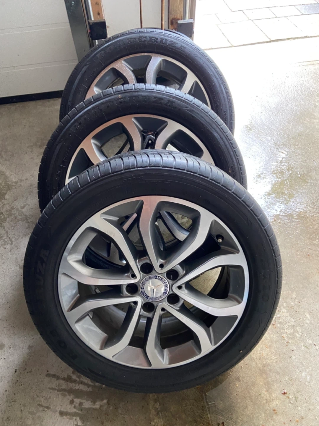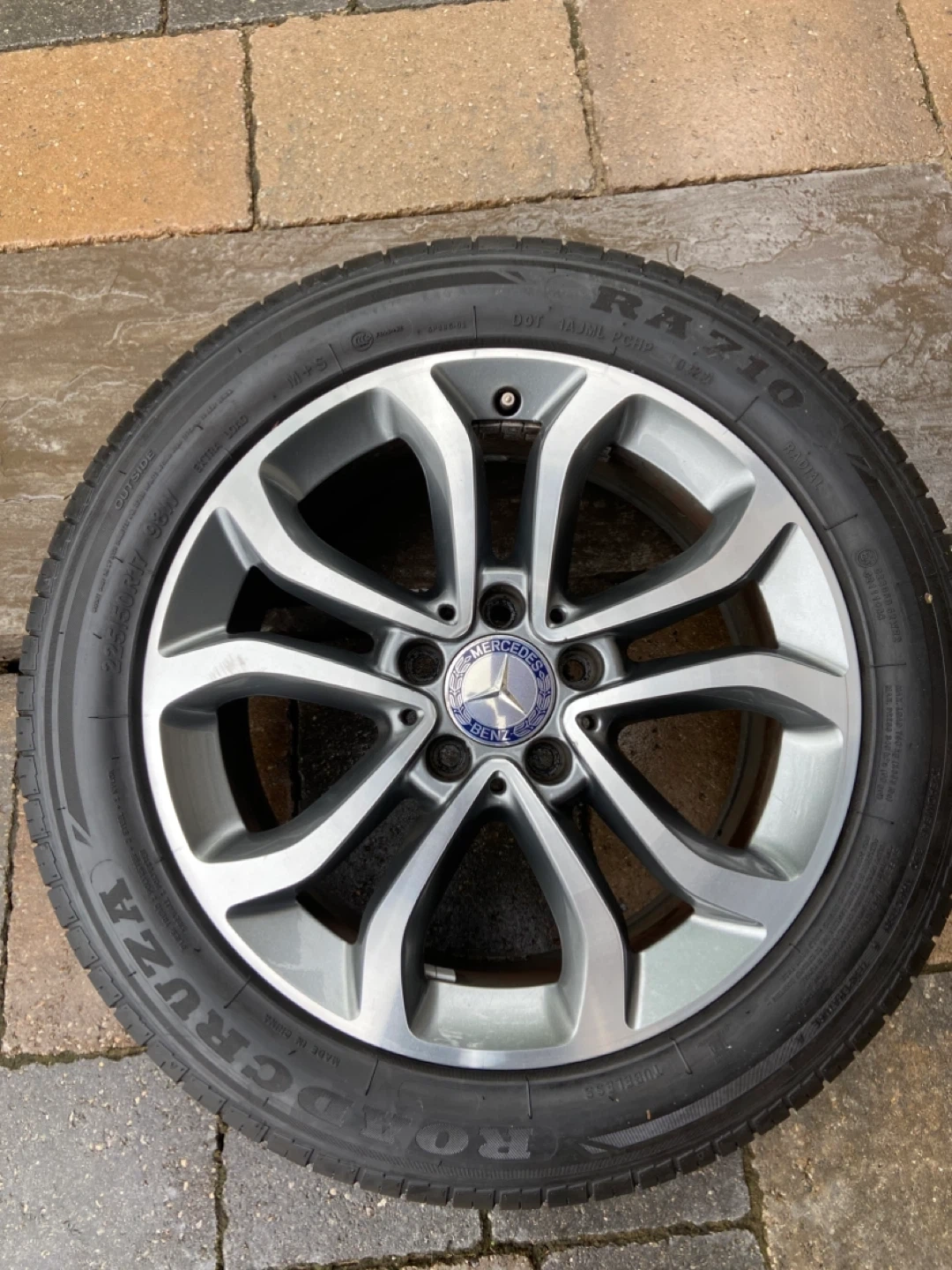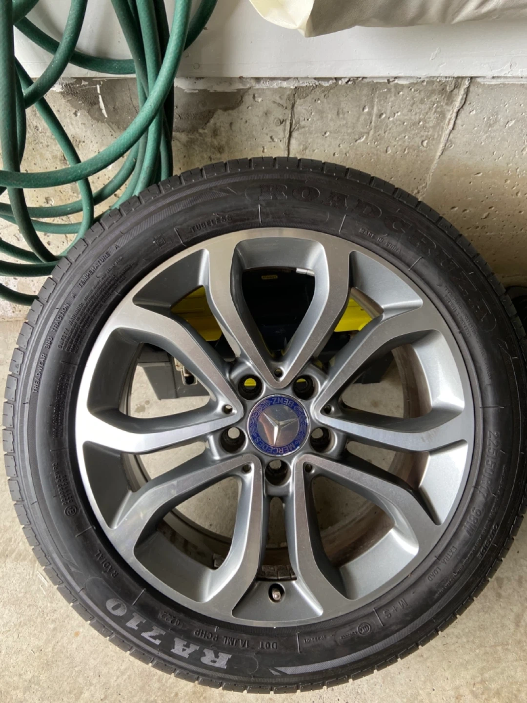Selling a Mercedes-Benz tire, size 225/50R17. The rims are in brand new shape the tires they’re still OK for one more season.
