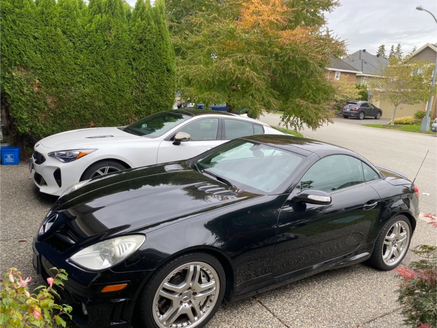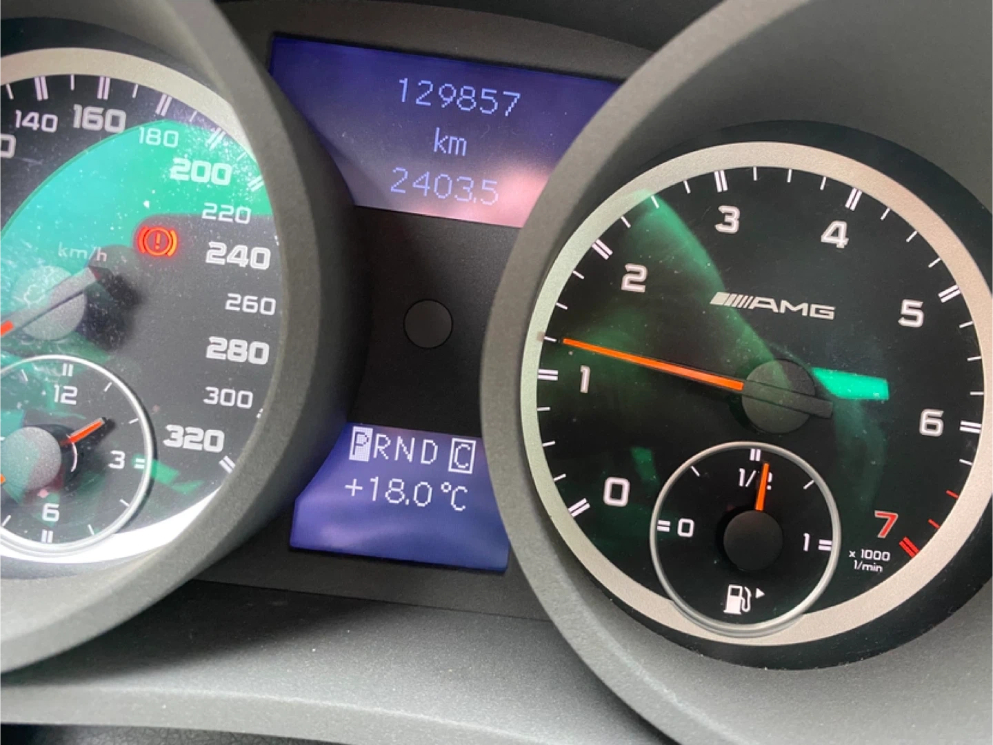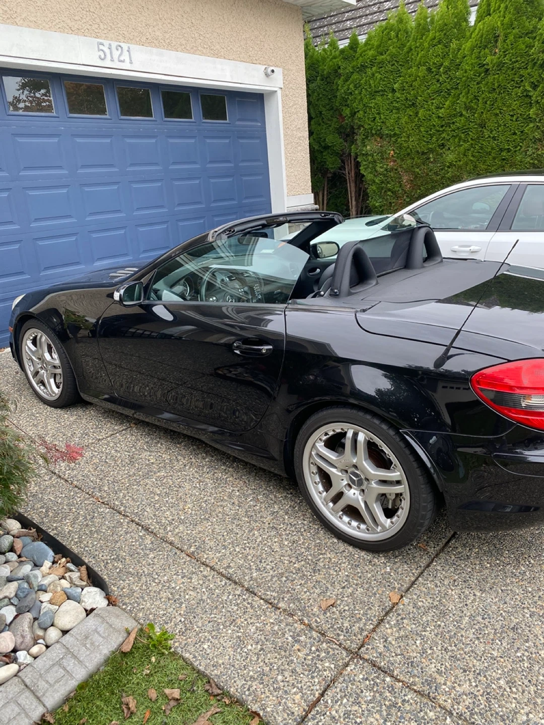 Selling a Mercedes-Benz SLK AMG. It's a black convertible with a powerful engine. The odometer reads 129857 km.