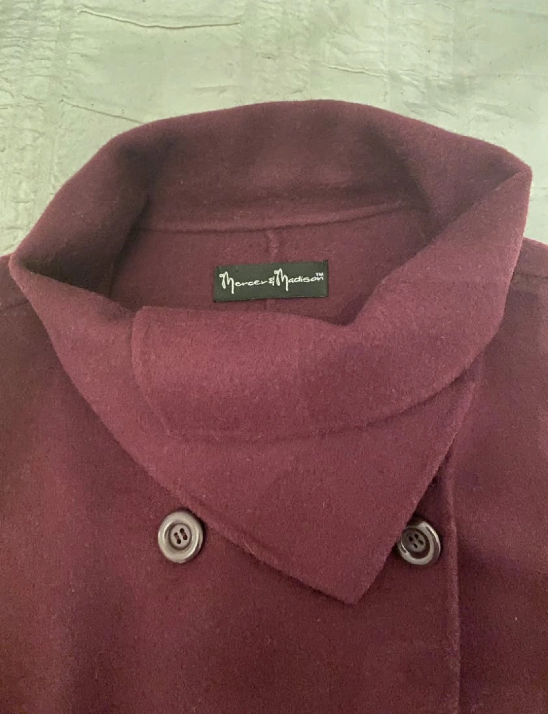 19I'm selling a lovely mulberry unlined double-breasted 100% wool jacket from Mercer & Madison. It's in great condition and ready for a new home! The colour is a beautiful, rich burgundy, perfect for adding a pop of colour to your wardrobe. Great for fall. Dry Clean only.