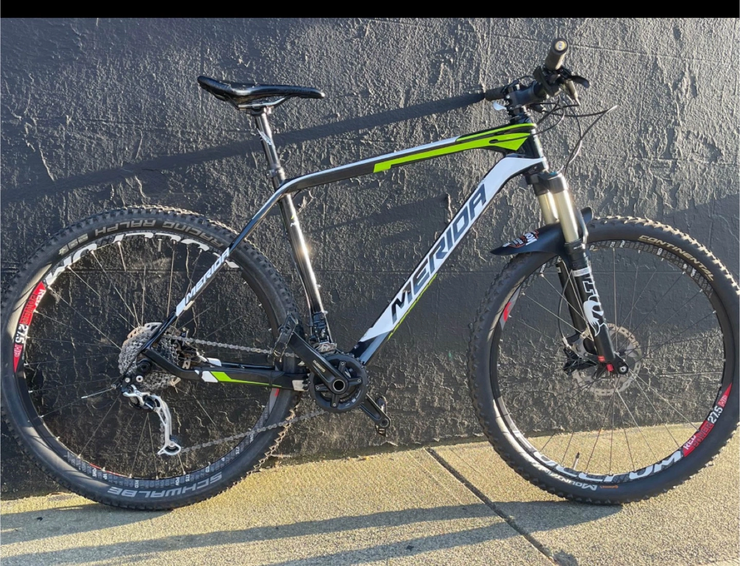Selling a Merida big seven carbon 27.5 mountain bike that's in great shape and ready for some off-road adventures! It features high-quality components and is perfect for tackling trails or cruising around town. The tires are Schwalbe, and the rear derailleur is Shimano. If you're looking for a reliable and fun mountain bike, this could be the one for you!