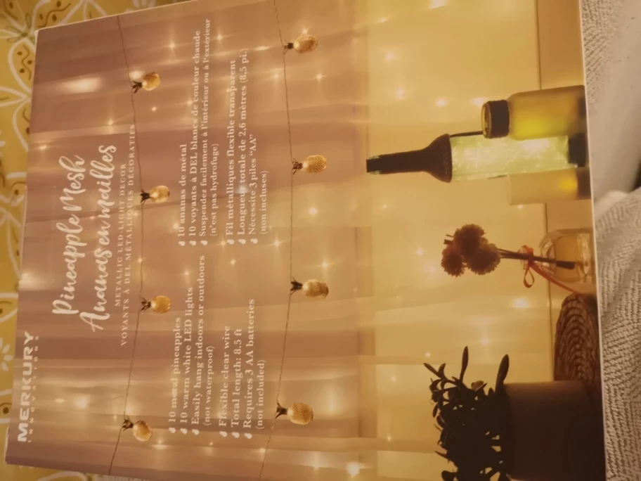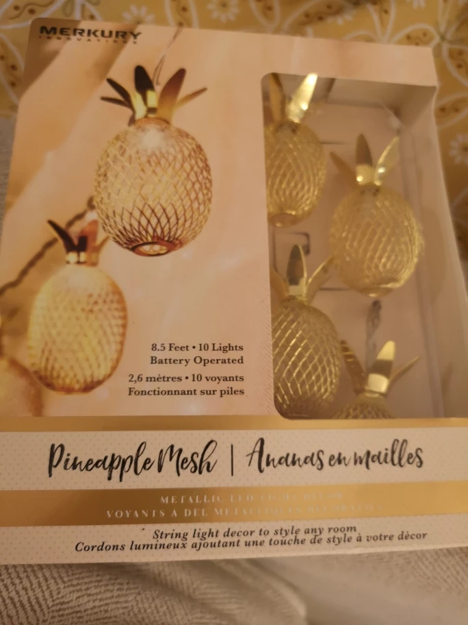 30I'm selling a brand new set of Merkury Innovations Pineapple Mesh string lights! These metallic LED lights are perfect for adding a touch of style to any room. The string is 8.5 feet long and features 10 warm white LED lights. They are battery operated, requiring 3 AA batteries (not included). The box is included!
